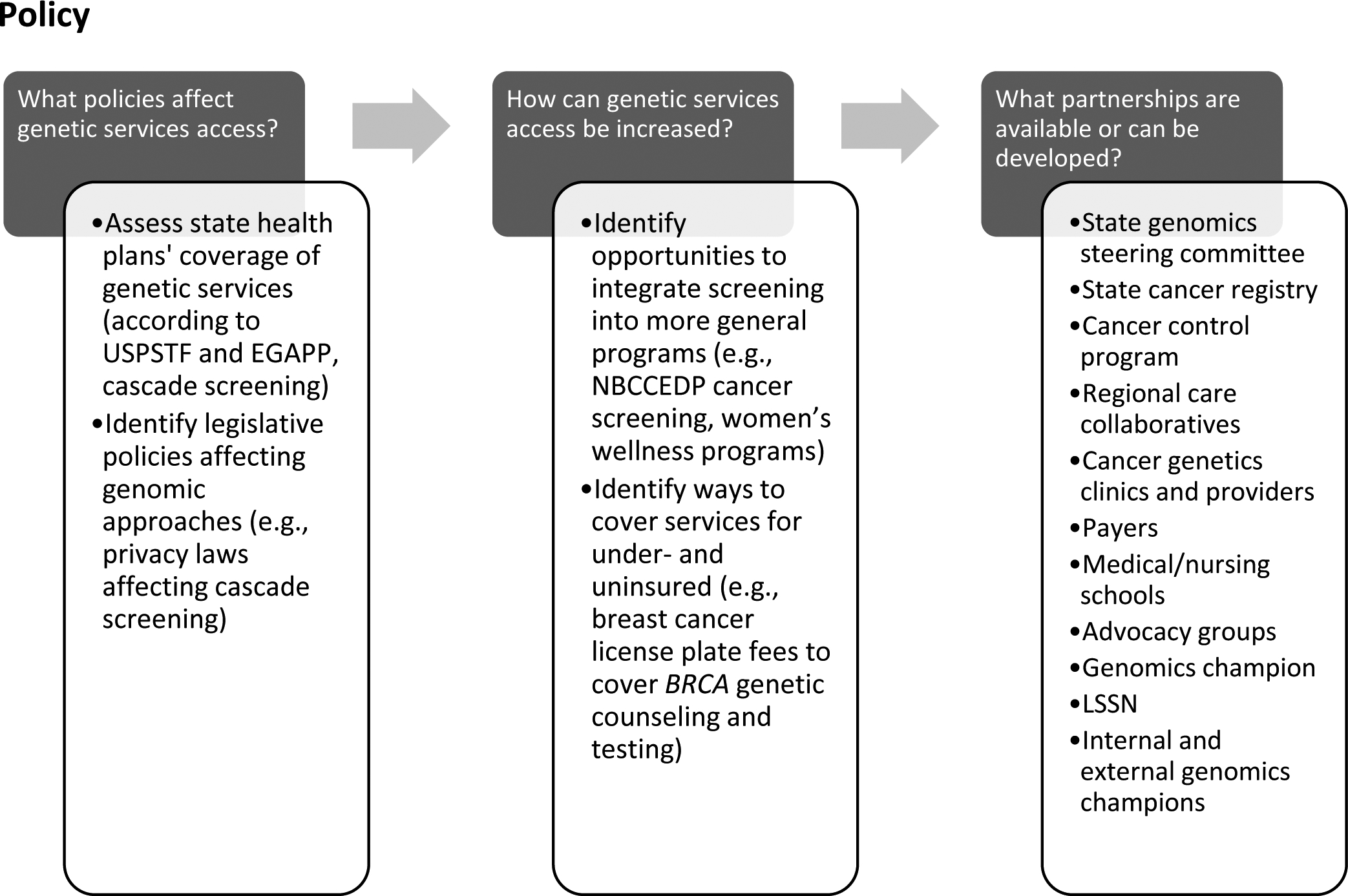 State health agencies’ cancer genomics activities included developing or adding to state surveillance systems, developing educational materials, bidirectional reporting, promoting health plan policy change, training providers, and promoting recommendations and standards. To address health disparities, programs have tracked group differences, developed culturally-appropriate educational materials, and promoted access to services for underserved populations.