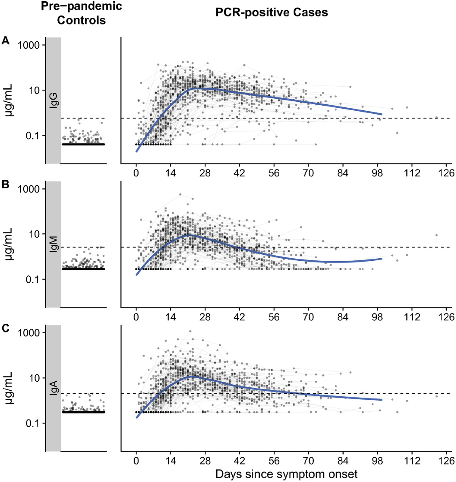 Description:We measured plasma and/or serum antibody responses to the receptor-binding domain (RBD) of the spike (S) protein of SARS-CoV-2 in 343 North American patients infected with SARS-CoV-2 (of which 93% required hospitalization) up to 122 days after symptom onset and compared them to responses in 1548 individuals whose blood samples were obtained prior to the pandemic. After setting seropositivity thresholds for perfect specificity (100%), we estimated sensitivities of 95% for IgG, 90% for IgA, and 81% for IgM for detecting infected individuals between 15 and 28 days after symptom onset. While the median time to seroconversion was nearly 12 days across all three isotypes tested, IgA and IgM antibodies against RBD were short-lived with median times to seroreversion of 71 and 49 days after symptom onset. In contrast, anti-RBD IgG responses decayed slowly through 90 days with only 3 seropositive individuals seroreverting within this time period. IgG antibodies to SARS-CoV-2 RBD were strongly correlated with anti-S neutralizing antibody titers, which demonstrated little to no decrease over 75 days since symptom onset. We observed no cross-reactivity of the SARS-CoV-2 RBD-targeted antibodies with other widely circulating coronaviruses (HKU1, 229 E, OC43, NL63). These data suggest that RBD-targeted antibodies are excellent markers of previous and recent infection, that differential isotype measurements can help distinguish between recent and older infections, and that IgG responses persist over the first few months after infection and are highly correlated with neutralizing antibodies.