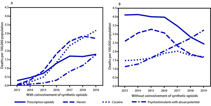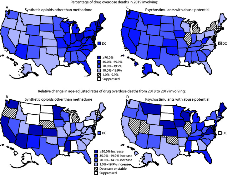 Description:Deaths involving synthetic opioids other than methadone (synthetic opioids), which largely consist of illicitly manufactured fentanyl; psychostimulants with abuse potential (e.g., methamphetamine); and cocaine have increased in recent years, particularly since 2013 (1,2). In 2019, a total of 70,630 drug overdose deaths occurred, corresponding to an age-adjusted rate of 21.6 per 100,000 population and a 4.3% increase from the 2018 rate (20.7) (3). CDC analyzed Trends in age-adjusted overdose death rates involving synthetic opioids, psychostimulants, cocaine, heroin, and prescription opioids during 2013-2019, as well as geographic patterns in synthetic opioid- and psychostimulant-involved deaths during 2018-2019. From 2013 to 2019, the synthetic opioid-involved death rate increased 1,040%, from 1.0 to 11.4 per 100,000 age-adjusted (3,105 to 36,359). The psychostimulant-involved death rate increased 317%, from 1.2 (3,627) in 2013 to 5.0 (16,167) in 2019. In the presence of synthetic opioid coinvolvement, death rates for prescription opioids, heroin, psychostimulants, and cocaine increased. In the absence of synthetic opioid coinvolvement, death rates increased only for psychostimulants and cocaine. From 2018 to 2019, the largest relative increase in the synthetic opioid-involved death rate occurred in the West (67.9%), and the largest relative increase in the psychostimulant-involved death rate occurred in the Northeast (43.8%); these increases represent important changes in the geographic distribution of drug overdose deaths. Evidence-based Prevention and response strategies including substance use disorder treatment and overdose Prevention and response efforts focused on polysubstance use must be adapted to address the evolving drug overdose epidemic.