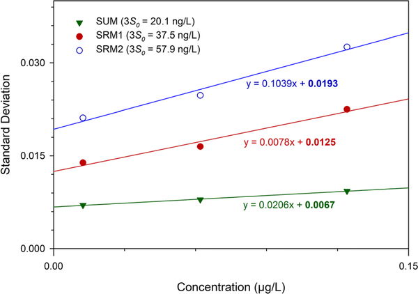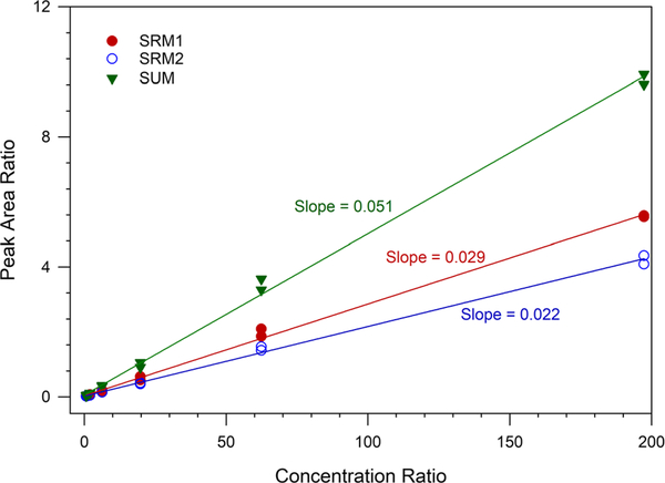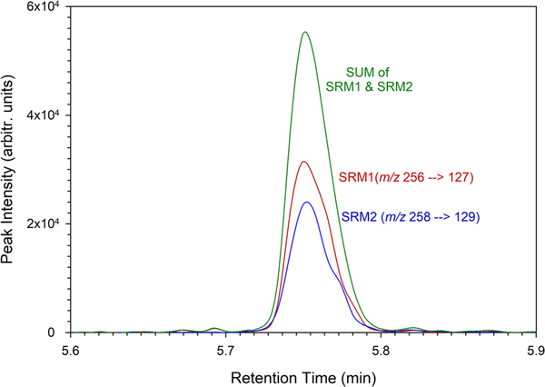 Description:Multiple ion transition summation of isotopologues (MITSI) is an adaptable and easy-to-implement methodology for improving analytical sensitivity, especially for halogenated compounds and otherwise abundant isotopologues. This novel application of signal summing was applied to measure and quantitate the two most abundant ion transitions of two isotopologues of N-acetyl-S-(1,2-dichlorovinyl)-L-cysteine (1DCV), a urinary metabolite of trichloroethylene (TCE). Because 1DCV is dichlorinated, only approximately half of the total potential signal is quantifiable when the monoisotopic ion transition (i.e., m/z 256 → 127 for |Cl|) is monitored. By summing the intensity of a separate and high-abundance 1DCV isotopologue ion transition (i.e., m/z 258 → 129 to include |Cl and |Cl), overall signal intensity increased by over 70%. This summation technique improved the analytical sensitivity and limit of detection (LOD) by factors of 2.3 and 2.9, respectively, compared to monitoring the two transitions separately, without summation. Separation and detection were performed using liquid chromatography-tandem mass spectrometry (LC-MS/MS) in negative-ion mode with scheduled selected reaction monitoring. This approach was verified for accuracy and precision using two quality control materials. In addition, we derived a modified signal summation equation to calculate predicted signal enhancements specific to the MITSI approach. Graphical Abstract .