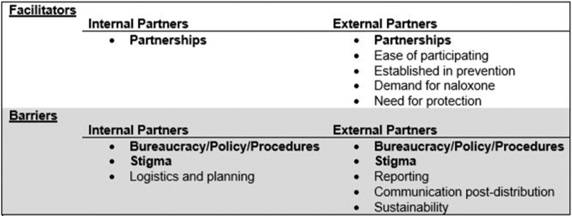 Structured interviews (n=26) were conducted among both internal and external stakeholders. Those who participated were >18 years of age and were the lead representative from agencies that either received naloxone (ie, external stakeholders) or helped implement the distribution (ie, internal stakeholders). The interviews followed standardised scripts and lasted approximately 40 min. Sessions were audio-recorded and transcribed. Qualitative content analysis was performed by two researchers to determine themes surrounding facilitators or barriers to programme implementation.