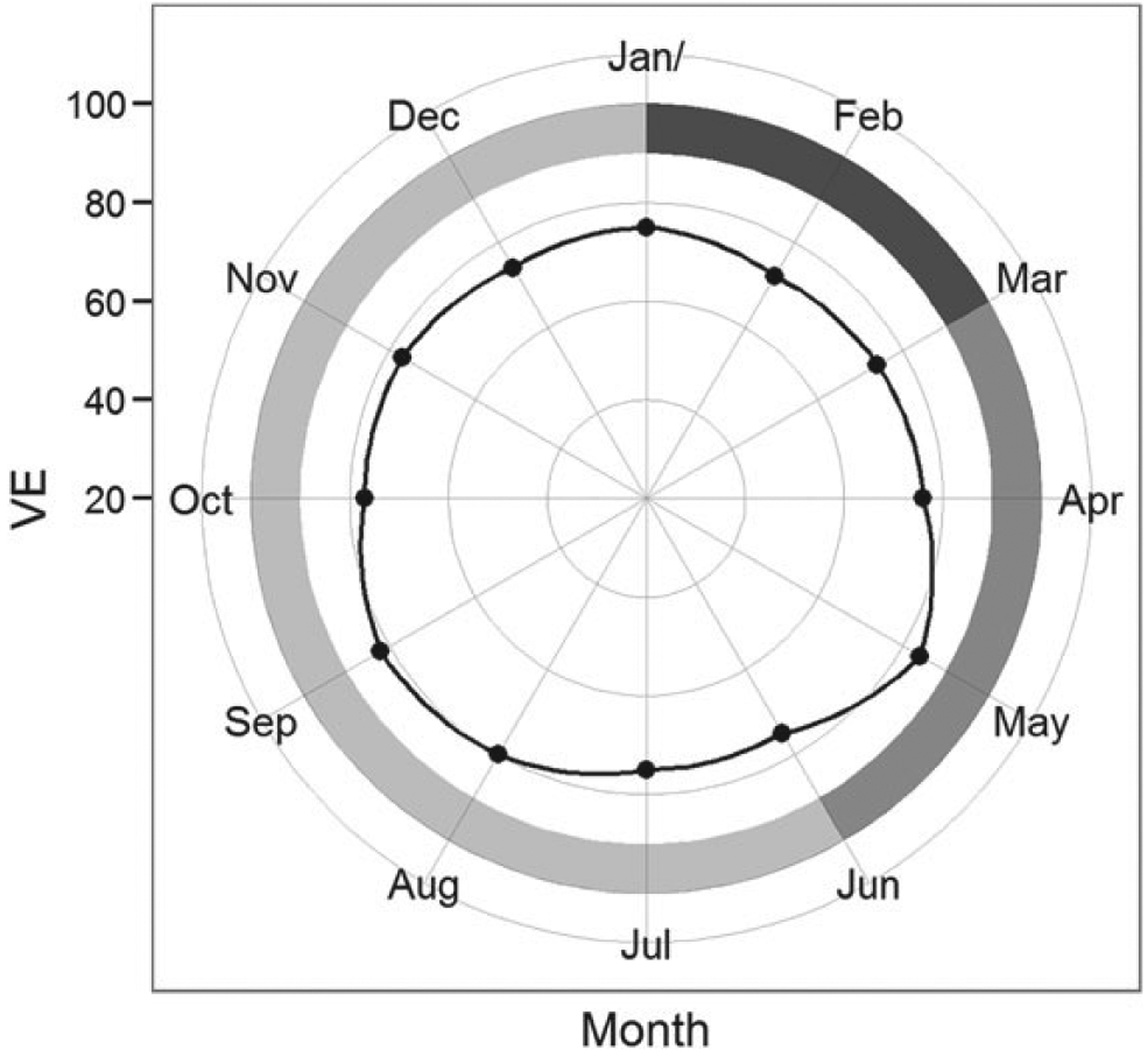 Description:Using data from rotavirus vaccine effectiveness (VE) studies, we assessed whether rotavirus season modifies rotavirus VE in infants. In the first year of life, adjusted VE was 72% for children born during rotavirus season and 84% for children born in other months (P = .01). Seasonal factors may interfere with vaccine performance.