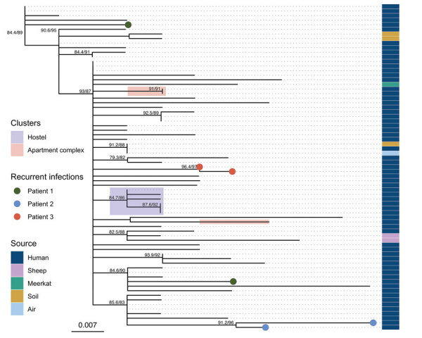 Description:Since 2005, the range of Burkholderia pseudomallei sequence type 562 (ST562) has expanded in northern Australia. During 2005-2019, ST562 caused melioidosis in 61 humans and 3 animals. Cases initially occurred in suburbs surrounding a creek before spreading across urban Darwin, Australia and a nearby island community. In urban Darwin, ST562 caused 12% (53/440) of melioidosis cases, a proportion that increased during the study period. We analyzed 2 clusters of cases with epidemiologic links and used genomic analysis to identify previously unassociated cases. We found that ST562 isolates from Hainan Province, China, and Pingtung County, Taiwan, were distantly related to ST562 strains from Australia. Temporal genomic analysis suggested a single ST562 introduction into the Darwin region in ≈1988. The origin and transmission mode of ST562 into Australia remain uncertain.