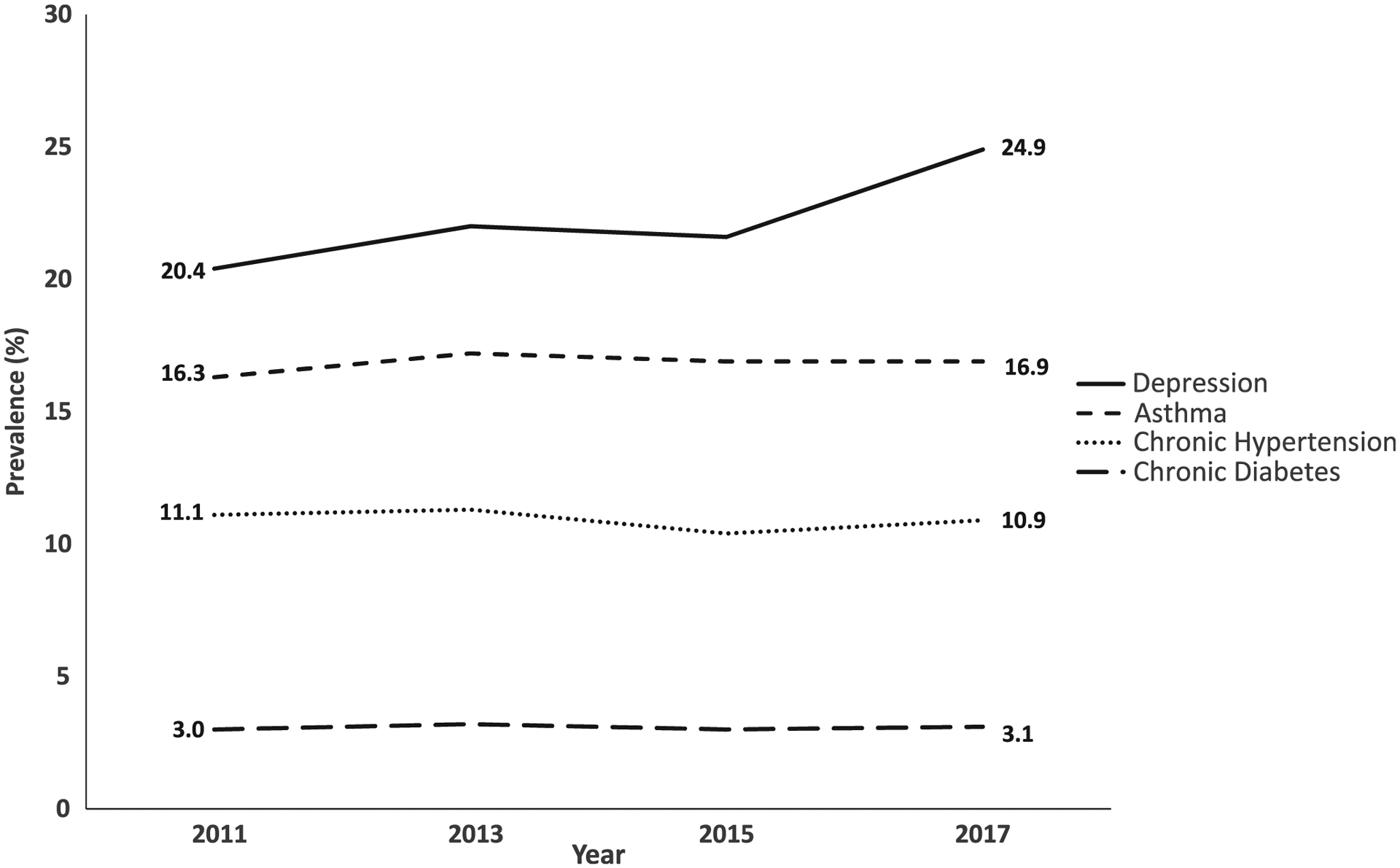 From 2011 to 2017, prevalence decreased for current smoking (20.7%–15.9%; p < 0.001), gestational diabetes (3.1%–2.7%; p = 0.003), and high cholesterol (19.0%–16.7%; p < 0.001); prevalence increased for depression (20.4%–24.9%; p < 0.001) and obesity (24.6%–27.6%; p < 0.001). After adjustment, in 2017 WRA were more likely to report asthma (APR = 1.06; 95% confidence interval [CI] = 1.01–1.11), physical inactivity (APR = 1.08; 95% CI = 1.04–1.12), obesity (APR = 1.15; 95% CI = 1.11–1.19), and depression (APR = 1.29; 95% CI = 1.25–1.34) compared with 2011. They were less likely to report high cholesterol (APR = 0.89; 95% CI = 0.85–0.94) in 2015 compared with 2011, and current smoking (APR = 0.86; 95% CI = 0.82–0.89) and gestational diabetes (APR = 0.84; 95% CI = 0.75–0.94) in 2017 compared with 2011.
