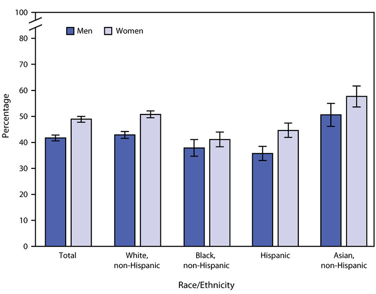 Description:In 2019, women aged ≥18 years were more likely than were men (48.9% versus 41.7%) to have had an influenza vaccination in the past 12 months. This pattern was found for non-Hispanic White adults (50.8% versus 42.9%), Hispanic adults (44.6% versus 35.7%), and non-Hispanic Asian adults (57.7% versus 50.7%), but there was no statistically significant difference by sex among non-Hispanic Black adults (41.1% versus 37.9%). For both men and women, non-Hispanic Black and Hispanic adults were less likely to have had an influenza vaccination in the past 12 months than were non-Hispanic White and non-Hispanic Asian adults.