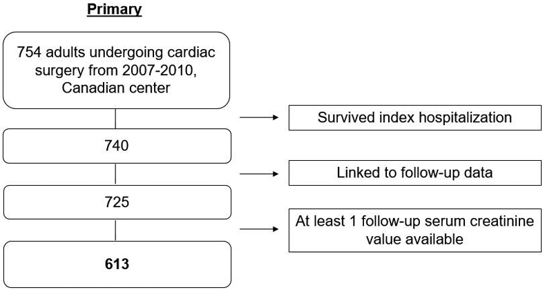 Description:Patients undergoing cardiac surgery are placed under intense physiologic stress. Blood and urine biomarkers measured peri-operatively may help identify patients at higher risk for adverse long-term kidney outcomes.We sought to determine independent associations of various biomarkers with development or progression of chronic kidney disease (CKD) following cardiac surgery. In this sub-study of the prospective cohort -TRIBE-AKI Study, we evaluated 613 adult patients undergoing cardiac surgery in Canada in our primary analysis and tested the association of 40 blood and urinary biomarkers with the primary composite outcome of CKD incidence or progression. In those with baseline estimated glomerular filtration rate (eGFR) over 60 mL/min/1.73m|, we defined CKD incidence as a 25% reduction in eGFR and an eGFR under 60. In those with baseline eGFR under 60 mL/min/1.73m|, we defined CKD progression as a 50% reduction in eGFR or eGFR under 15. Results were evaluated in a replication cohort of 310 patients from one study site in the United States. Over a median follow-up of 5.6 years, 172 patients developed the primary outcome. Each log increase in basic fibroblast growth factor (adjusted hazard ratio 1.52 [95% confidence interval 1.19, 1.93]), Kidney Injury Molecule-1 (1.51 [0.98, 2.32]), N-terminal pro-B-type natriuretic peptide (1.19 [1.01, 1.41]), and tumor necrosis factor receptor 1 (1.75 [1.18, 2.59]) were associated with outcome after adjustment for demographic factors, serum creatinine, and albuminuria. Similar results were noted in the replication cohort. Although there was no interaction by acute kidney injury in continuous analysis, mortality was higher in the no acute kidney injury group by biomarker tertile. Thus, elevated post-operative levels of blood biomarkers following cardiac surgery were independently associated with the development of CKD. These biomarkers can provide additional value in evaluating CKD incidence and progression after cardiac surgery.