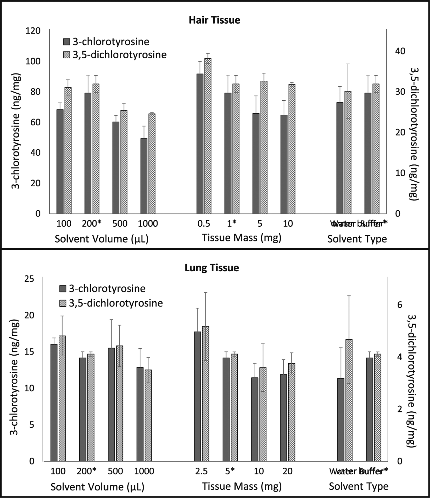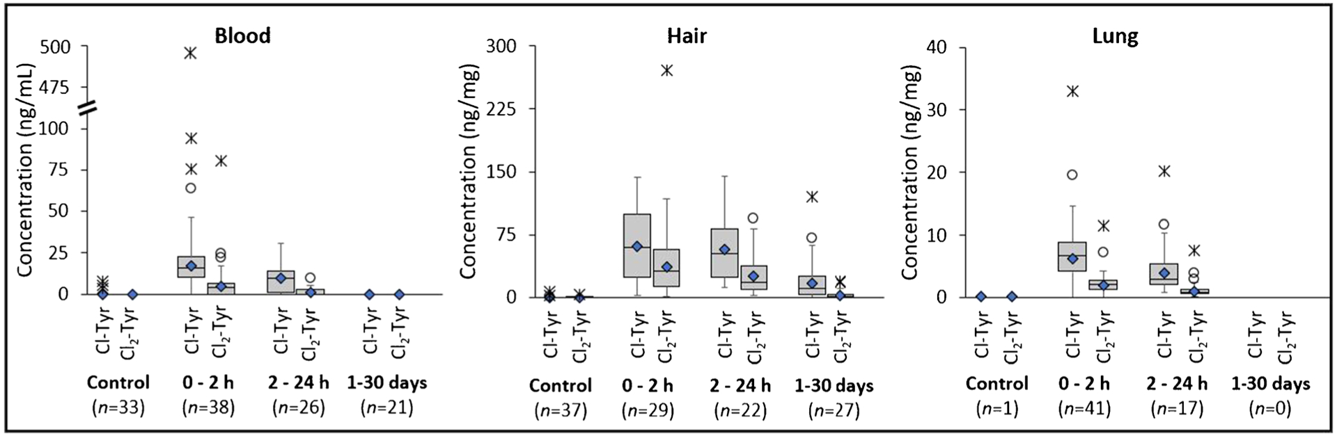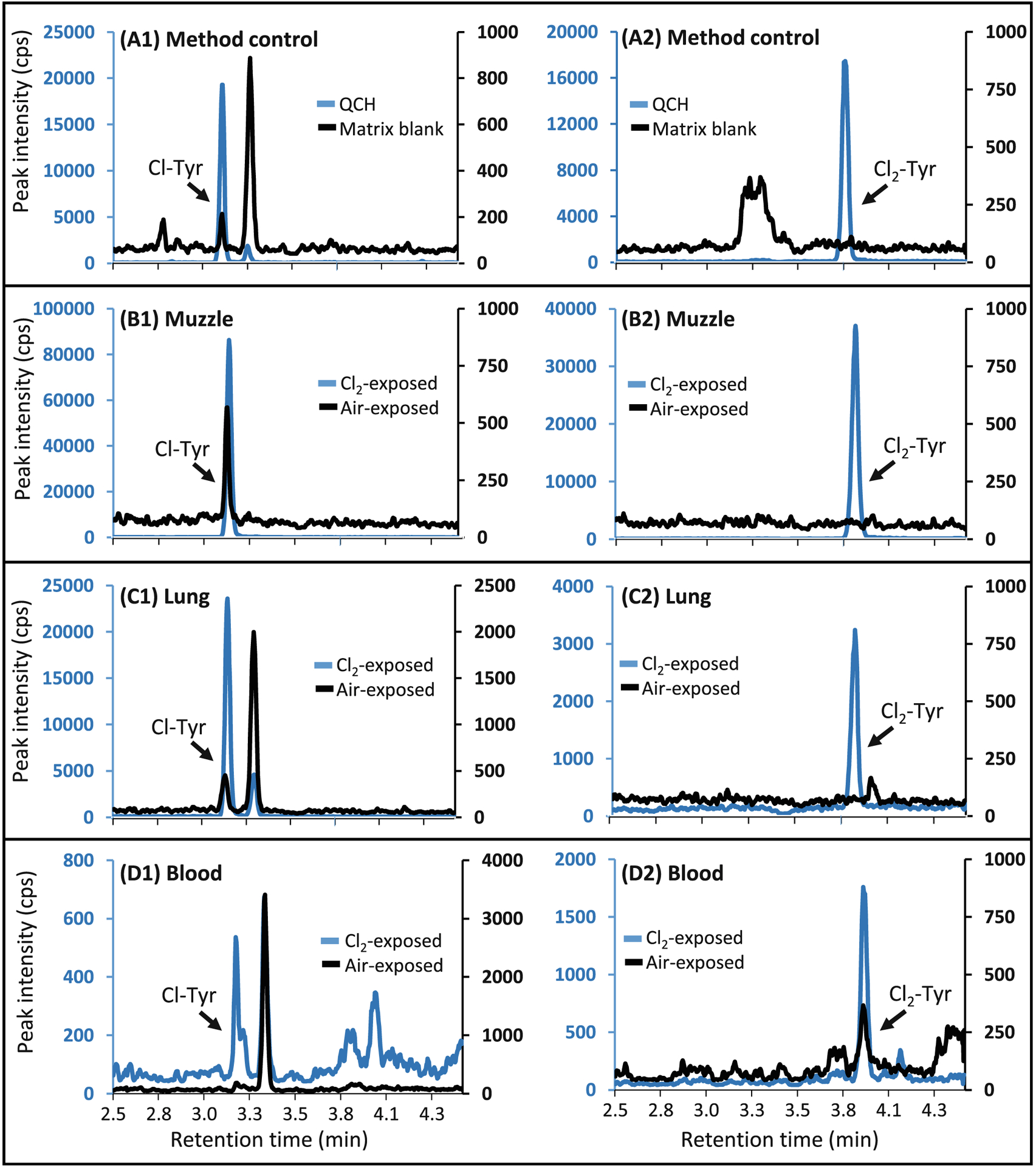 Description:Chlorine is a toxic industrial chemical with a history of use as a chemical weapon. Chlorine is also produced, stored, and transported in bulk making it a high-priority pulmonary threat in the USA. Due to the high reactivity of chlorine, few biomarkers exist to identify exposure in clinical and environmental samples. Our laboratory evaluates acute chlorine exposure in clinical samples by measuring 3-chlorotyrosine (Cl-Tyr) and 3,5-dichlorotyrosine (Cl|-Tyr) using liquid chromatography tandem mass spectrometry (LC-MS/MS). Individuals can have elevated biomarker levels due to their environment and chronic health conditions, but levels are significantly lower in individuals exposed to chlorine. Historically these biomarkers have been evaluated in serum, plasma, blood, and bronchoalveolar lavage (BAL) fluid. We report the expansion into hair and lung tissue samples using our newly developed tissue homogenization protocol which fits seamlessly with our current chlorinated tyrosine quantitative assay. Furthermore, we have updated the chlorinated tyrosine assay to improve throughput and ruggedness and reduce sample volume requirements. The improved assay was used to measure chlorinated tyrosine levels in 198 mice exposed to either chlorine gas or air. From this animal study, we compared Cl-Tyr and Cl|-Tyr levels among three matrices (i.e., lung, hair, and blood) and found that hair had the most abundant chlorine exposure biomarkers. Furthermore, we captured the first timeline of each analyte in the lung, hair, and blood samples. In mice exposed to chlorine gas, both Cl-Tyr and Cl|-Tyr were present in blood and lung samples up to 24 h and up to 30 days in hair samples.
