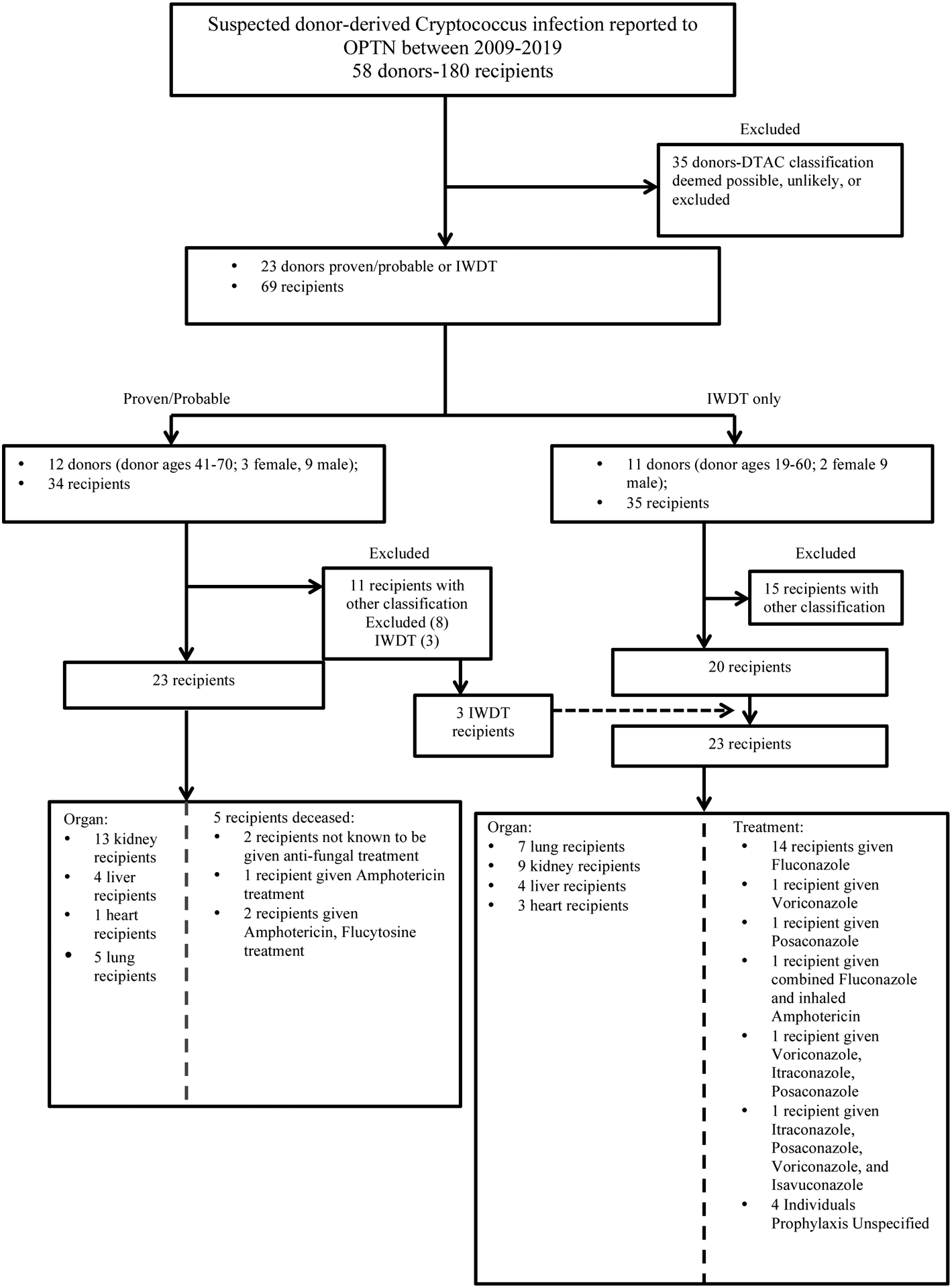Description:Cryptococcus species can cause serious life-threatening infection in solid organ transplant recipients by reactivation of prior infection, posttransplant de novo infection, or donor transmission from the transplanted organ. Although previously reported in the literature, the extent of donor-derived cryptococcosis in the United States has not been documented. We analyzed potential donor-derived Cryptococcus transmission events reported to the Organ Procurement and Transplantation Network (OPTN) for investigation by the Ad Hoc Disease Transmission Advisory Committee (DTAC). All reports between 2009 and 2019 in which transmission to recipients was designated proven or probable, or determined to be averted due to implementation of prophylaxis (intervention without disease transmission-"IWDT") were included. During 2009-2019, 58 reports of potential donor-derived cryptococcosis were submitted to DTAC. Among these reports, 12 donors were determined to have resulted in proven or probable transmission to 23/34 (67.6%) recipients. Most of these donors (10/12 [83%]) exhibited central nervous system-related symptoms prior to death and 5/23 (22%) infected recipients died. For 11 different donors, prophylaxis, most often with fluconazole, was administered to 23/35 (65.7%) recipients. Clinicians should maintain awareness of donor-derived cryptococcosis and consider prompt prophylaxis or treatment followed by reporting to OPTN for further investigation.
