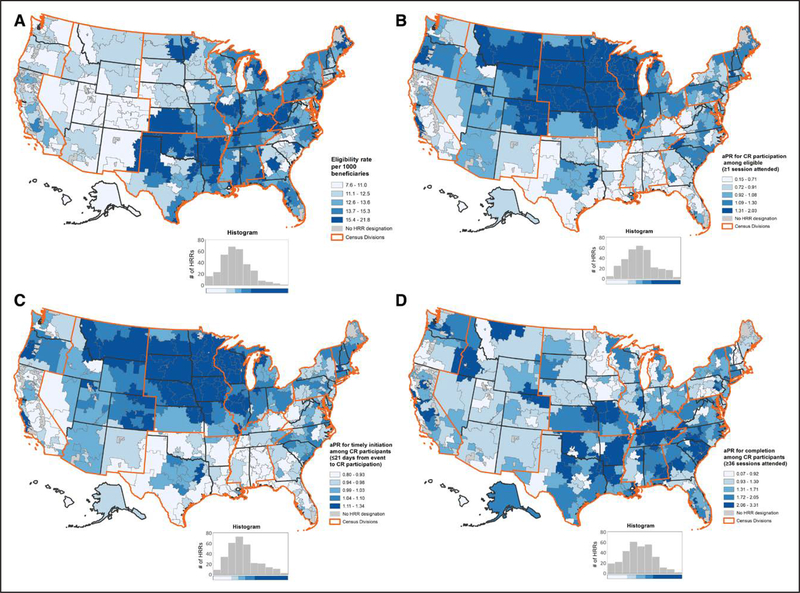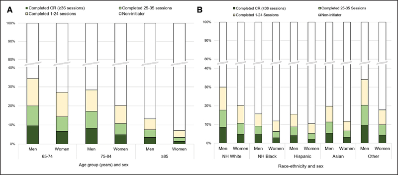 We identified Medicare fee-for-service beneficiaries who were CR eligible in 2016, and assessed CR participation (≥1 CR session attended), timely initiation (participation within 21 days of event), and completion (≥36 sessions attended) through 2017. Measures were assessed overall, by beneficiary characteristics and geography, and by primary CR-qualifying event type (acute myocardial infarction hospitalization; coronary artery bypass surgery; heart valve repair/replacement; percutaneous coronary intervention; or heart/heart-lung transplant). Among 366 103 CR-eligible beneficiaries, 89 327 (24.4%) participated in CR, of whom 24.3% initiated within 21 days and 26.9% completed CR. Eligibility was highest in the East South Central Census Division (14.8 per 1000). Participation decreased with increasing age, was lower among women (18.9%) compared with men (28.6%; adjusted prevalence ratio: 0.91 [95% CI, 0.90–0.93]) was lower among Hispanics (13.2%) and non-Hispanic blacks (13.6%) compared with non-Hispanic whites (25.8%; adjusted prevalence ratio: 0.63 [0.61–0.66] and 0.70 [0.67–0.72], respectively), and varied by hospital referral region and Census Division (range: 18.6% [East South Central] to 39.1% [West North Central]) and by qualifying event type (range: 7.1% [acute myocardial infarction without procedure] to 55.3% [coronary artery bypass surgery only]). Timely initiation varied by geography and qualifying event type; completion varied by geography.