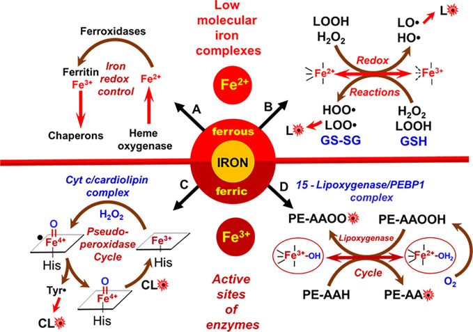 Description:A huge diversification of phospholipids, forming the aqueous interfaces of all biomembranes, cannot be accommodated within a simple concept of their role as membrane building blocks. Indeed, a number of signaling functions of (phospho)lipid molecules has been discovered. Among these signaling lipids, a particular group of oxygenated polyunsaturated fatty acids (PUFA), so called lipid mediators, has been thoroughly investigated over several decades. This group includes oxygenated octadecanoids, eicosanoids, and docosanoids and includes several hundreds of individual species. Oxygenation of PUFA can occur when they are esterified into major classes of phospholipids. Initially, these events have been associated with non-specific oxidative injury of biomembranes. An alternative concept is that these post-synthetically oxidatively modified phospholipids and their adducts with proteins are a part of a redox epiphospholipidome that represents a rich and versatile language for intra- and inter-cellular communications. The redox epiphospholipidome may include hundreds of thousands of individual molecular species acting as meaningful biological signals. This review describes the signaling role of oxygenated phospholipids in programs of regulated cell death. Although phospholipid peroxidation has been associated with almost all known cell death programs, we chose to discuss enzymatic pathways activated during apoptosis and ferroptosis and leading to peroxidation of two phospholipid classes, cardiolipins (CLs) and phosphatidylethanolamines (PEs). This is based on the available LC-MS identification and quantitative information on the respective peroxidation products of CLs and PEs. We focused on molecular mechanisms through which two proteins, a mitochondrial hemoprotein cytochrome | (cyt |), and non-heme Fe lipoxygenase (LOX), change their catalytic properties to fulfill new functions of generating oxygenated CL and PE species. Given the high selectivity and specificity of CL and PE peroxidation we argue that enzymatic reactions catalyzed by cyt |/CL complexes and 15-lipoxygenase/phosphatidylethanolamine binding protein 1 (15LOX/PEBP1) complexes dominate, at least during the initiation stage of peroxidation, in apoptosis and ferroptosis. We contrast cell-autonomous nature of CLox signaling in apoptosis correlating with its anti-inflammatory functions | non-cell-autonomous ferroptotic signaling facilitating pro-inflammatory (necro-inflammatory) responses. Finally, we propose that small molecule mechanism-based regulators of enzymatic phospholipid peroxidation may lead to highly specific anti-apoptotic and anti-ferroptotic therapeutic modalities.