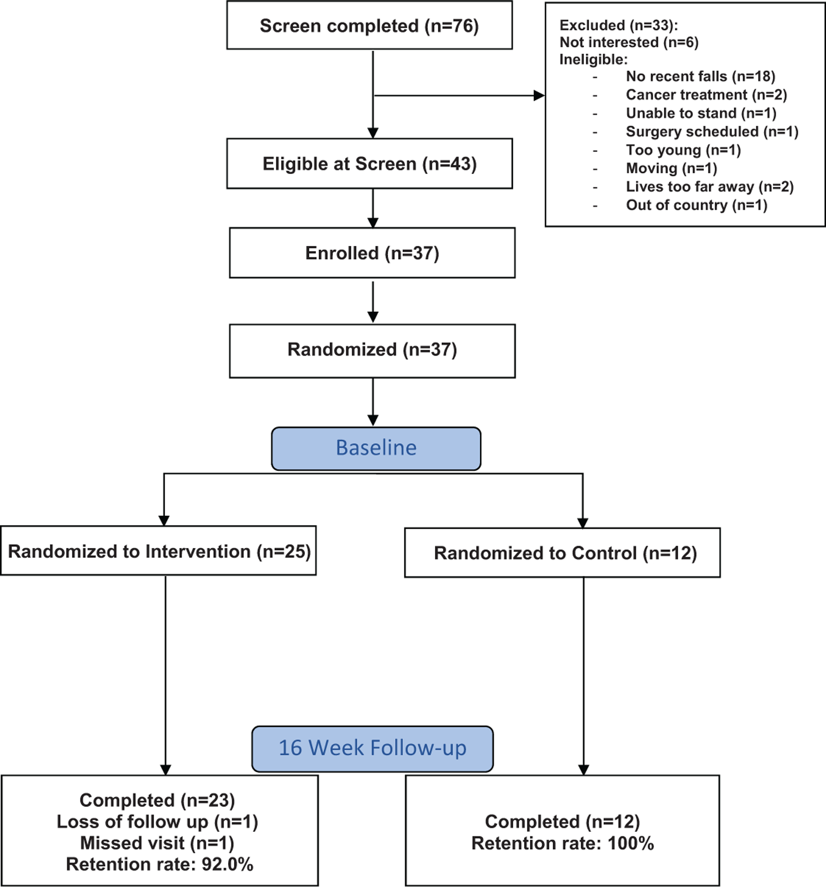 Timed Up and Go (TUG) and Tandem stand. Falls efficacy, feasibility, and acceptability of the intervention.