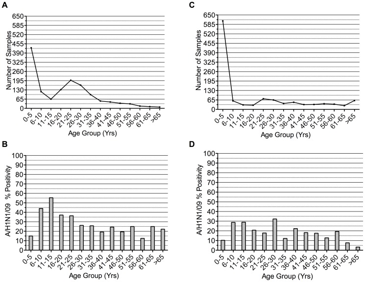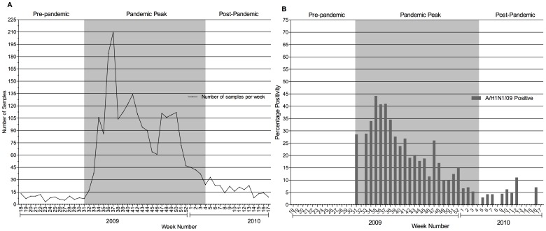 Consecutive patients (n = 2588) presenting to our hospital with influenza like illness (ILI) or severe acute respiratory infection (SARI) during a 1-year period (May 2009–April 2010) were prospectively recruited and tested for influenza A by real-time RT-PCR. Analysis of weekly trends showed an 11-fold increase in patients presenting with ILI/SARI during the peak pandemic period when compared with the pre-pandemic period and a significant (P<0.001) increase in SARI admissions during the pandemic period (30±15.9 admissions/week) when compared with pre-pandemic (7±2.5) and post-pandemic periods (5±3.8). However, Influenza A was detected in less than one-third of patients with ILI/SARI [699 (27.0%)]; a majority of these (557/699, 79.7%) were Pandemic (H1N1)2009 virus [A/H1N1/09]. An A/H1N1/09 positive test was correlated with shorter symptom duration prior to presentation (p = 0.03). More ILI cases tested positive for A/H1N1/09 when compared with SARI (27.4% vs. 14.6%, P = 0.037). When the entire study population was considered, A/H1N1/09 positivity was associated with lower risk of hospitalization (p<0.0001) and ICU admission (p = 0.013) suggesting mild self-limiting illness in a majority.