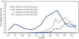 Description:In late June 2020, the percentage of ED visits for COVID-19 increased and reached a peak of 2.8% of all ED visits in early July before declining through August. This decline was followed by a larger and more prolonged increase beginning in September 2020 that reached a peak (7.2%) in early January 2021. Influenza activity generally begins in October with increased activity throughout the winter months. By the beginning of February 2018, the percentage of ED visits for influenza reached 3.1%, and by the beginning of February 2019, reached 5.0%. During June 2020–March 2021, ED visits for influenza accounted for less than 0.1% of all visits.