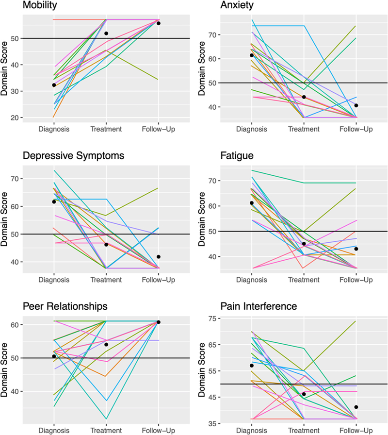 We administered the Chichewa Pediatric Patient-Reported Outcome Measurement Information System Pediatric (PROMIS)-25 at diagnosis, active treatment, and follow-up among pediatric lymphoma patients in Lilongwe, Malawi. Mean scores were calculated for the six PROMIS-25 HRQoL domains (Mobility, Anxiety, Depressive Symptoms, Fatigue, Peer Relationships, Pain Interference). Differences in HRQoL throughout treatment were compared using the minimally important difference (MID) and an ANOVA analysis. Kaplan-Meier survival estimates and Cox hazard ratios for mortality are reported.