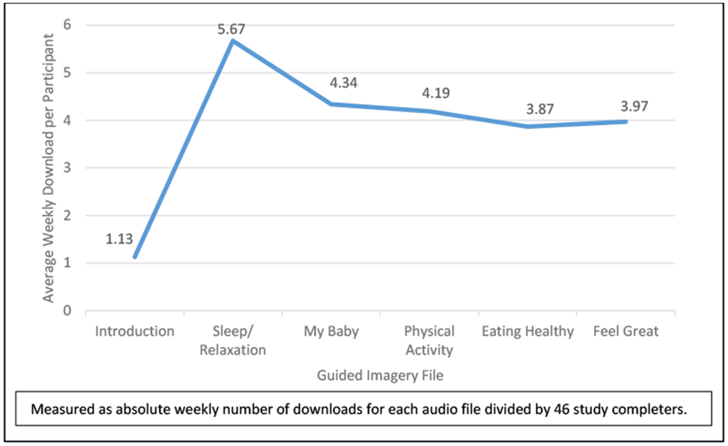 58 participants (Mean age, 28.5 years) were enrolled from January to June of 2018. Cloud analytics data showed an average of 4.96 audio downloads per week with the Sleep and Relaxation file being the most widely used (Mean weekly usage, 5.67) and reported favorite during follow-up interviews. Paired t-tests from pre- to post-test showed significant reductions in depression, anxiety, and stress, increased physical activity, and sedentary behavior along with some changes in body image.