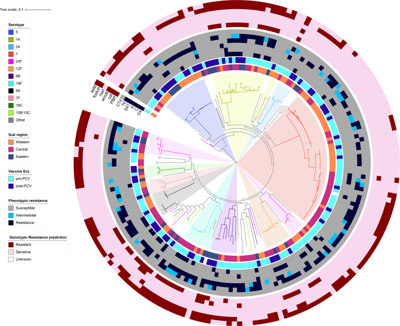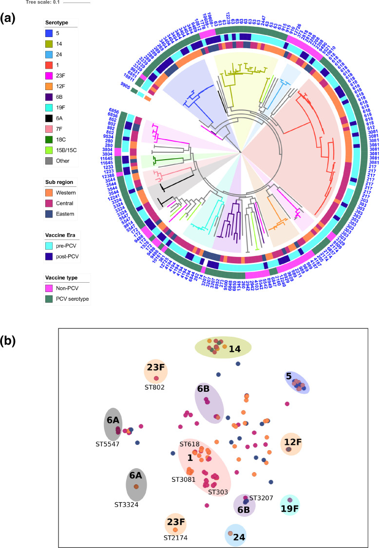 Description:Despite contributing to the large disease burden in West Africa, little is known about the genomic epidemiology of | which cause meningitis among children under 5 years old in the region. We analysed whole-genome sequencing data from 185 |. | isolates recovered from suspected paediatric meningitis cases as part of the World Health Organization (WHO) invasive bacterial diseases surveillance from 2010 to 2016. The phylogeny was reconstructed, accessory genome similarity was computed and antimicrobial-resistance patterns were inferred from the genome data and compared to phenotypic resistance from disc diffusion. We studied the changes in the distribution of serotypes pre- and post-pneumococcal conjugate vaccine (PCV) introduction in the Central and Western sub-regions separately. The overall distribution of non-vaccine, PCV7 (4, 6B, 9V, 14, 18C, 19F and 23F) and additional PCV13 serotypes (1, 3, 5, 6A, 19A and 7F) did not change significantly before and after PCV introduction in the Central region (Fisher's test | value 0.27) despite an increase in the proportion of non-vaccine serotypes to 40 % (|=6) in the post-PCV introduction period compared to 21.9 % (|=14). In the Western sub-region, PCV13 serotypes were more dominant among isolates from The Gambia following the introduction of PCV7, 81 % (|=17), compared to the pre-PCV period in neighbouring Senegal, 51 % (|=27). The phylogeny illustrated the diversity of strains associated with paediatric meningitis in West Africa and highlighted the existence of phylogeographical clustering, with isolates from the same sub-region clustering and sharing similar accessory genome content. Antibiotic-resistance genotypes known to confer resistance to penicillin, chloramphenicol, co-trimoxazole and tetracycline were detected across all sub-regions. However, there was no discernible trend linking the presence of resistance genotypes with the vaccine introduction period or whether the strain was a vaccine or non-vaccine serotype. Resistance genotypes appeared to be conserved within selected sub-clades of the phylogenetic tree, suggesting clonal inheritance. Our data underscore the need for continued surveillance on the emergence of non-vaccine serotypes as well as chloramphenicol and penicillin resistance, as these antibiotics are likely still being used for empirical treatment in low-resource settings. This article contains data hosted by Microreact.