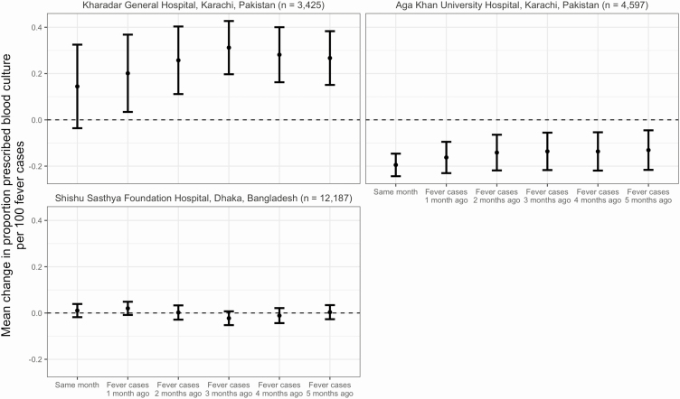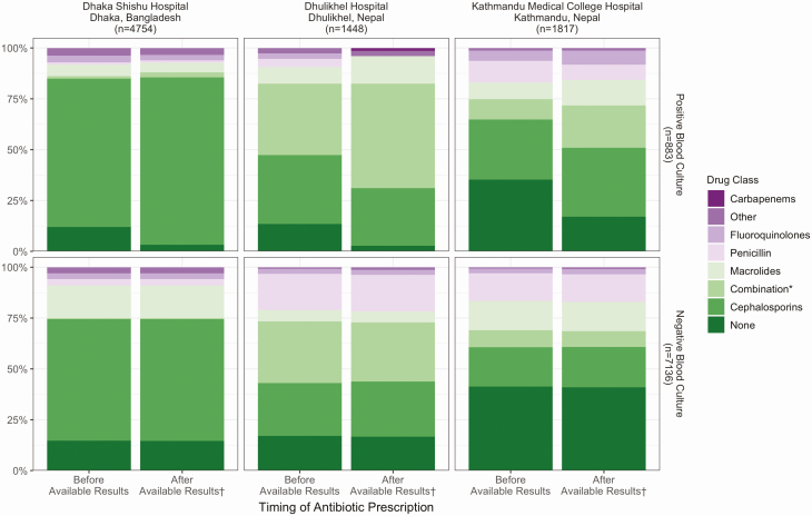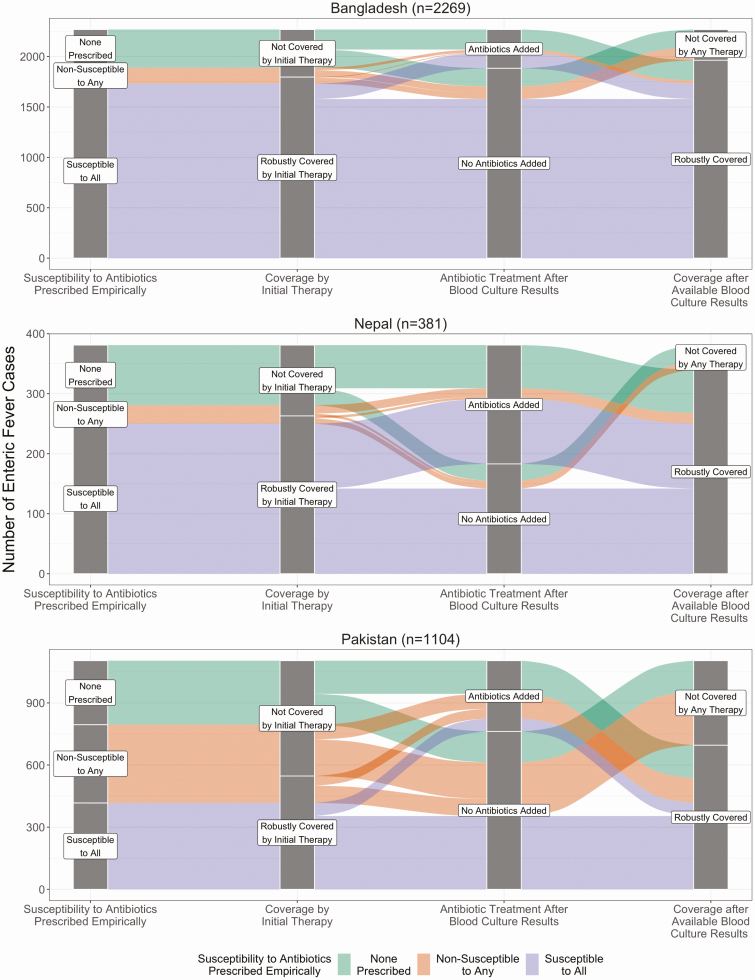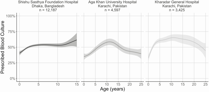 We screened suspected enteric fever cases from 6 hospitals in Bangladesh, Nepal, and Pakistan, and enrolled patients if blood culture was prescribed by the treating physician. We used generalized additive regression models to analyze the probability of receiving blood culture by age, and linear regression models to analyze changes by month to the proportion of febrile cases prescribed a blood culture compared with the burden of febrile illness, stratified by hospital. We used logistic regression to analyze predictors for receiving antibiotics empirically. We descriptively reviewed changes in antibiotic therapy by susceptibility patterns and coverage, stratified by country.