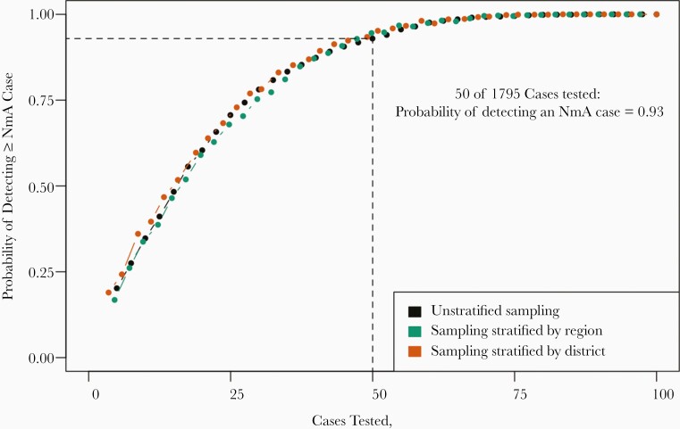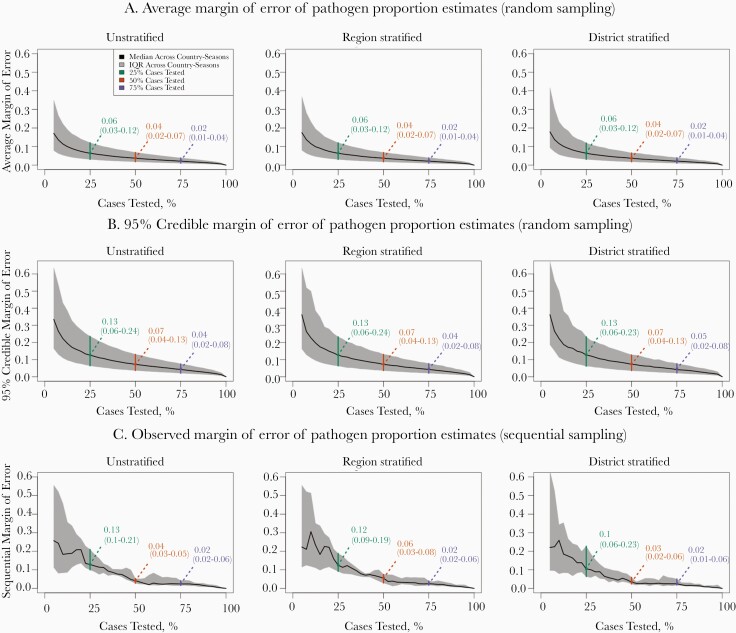 Description:Since 2010, the introduction of an effective serogroup A meningococcal conjugate vaccine has led to the near-elimination of invasive Neisseria meningitidis serogroup A disease in Africa's meningitis belt. However, a significant burden of disease and epidemics due to other bacterial meningitis pathogens remain in the region. High-quality surveillance data with laboratory confirmation is important to monitor circulating bacterial meningitis pathogens and design appropriate interventions, but complete testing of all reported cases is often infeasible. Here, we use case-based surveillance data from 5 countries in the meningitis belt to determine how accurately estimates of the distribution of causative pathogens would represent the true distribution under different laboratory testing strategies. Detailed case-based surveillance data was collected by the MenAfriNet surveillance consortium in up to 3 seasons from participating districts in 5 countries. For each unique country-season pair, we simulated the accuracy of laboratory surveillance by repeatedly drawing subsets of tested cases and calculating the margin of error of the estimated proportion of cases caused by each pathogen (the greatest pathogen-specific absolute error in proportions between the subset and the full set of cases). Across the 12 country-season pairs analyzed, the 95% credible intervals around estimates of the proportion of cases caused by each pathogen had median widths of ±0.13, ±0.07, and ±0.05, respectively, when random samples of 25%, 50%, and 75% of cases were selected for testing. The level of geographic stratification in the sampling process did not meaningfully affect accuracy estimates. These findings can inform testing thresholds for laboratory surveillance programs in the meningitis belt.