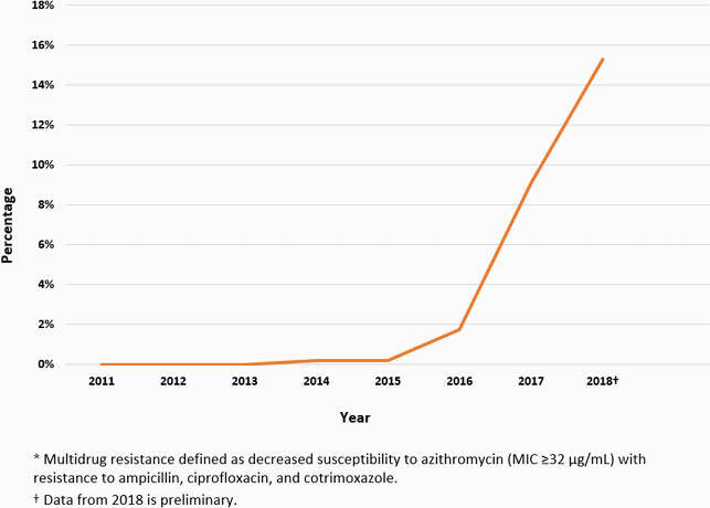 NARMS tested 2,781 S. sonnei surveillance isolates during 2011–2018; 80 (2.9%) were MDR, including 1 (0.04%) that was XDR. MDR isolates were from men (87%), women (9%), and children (4%). MDR increased from 0% in 2011 to 15.3% in 2018 (Figure). In 2020, we identified XDR isolates from 3 US residents on the same cruise as the Australians. The US residents were 41–42 year-old men; 2 with available information were MSM. The US and Australian isolates were highly related (0–1 alleles). Short-read sequence data from all 3 US isolates mapped to the blaCTX-M-27 harboring IncFII plasmids from the 2 Australian isolates with >99% nucleotide identity. blaCTX-M-27 genes confer ceftriaxone resistance.