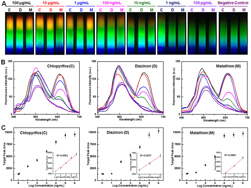 Description:Current techniques for the detection of multi-pesticides are limited by technical complexity, sensitivity and cost. There is an urgent demand of developing new specific recognition elements and sensitive signal readouts for on-site monitoring. In this work, we developed a fluorescent aptamer-based lateral flow biosensor (apta-LFB) integrated with fluorophore-quencher nano-pairs and a smartphone spectrum reader to accomplish triple-target detection of chlorpyrifos, diazinon, and malathion. Aptamers serve as alternative recognition elements instead of antibodies in LFB, offering better specificity and stability. A novel fluorophore-quencher nano-pair (quantum dots nanobeads and gold nanostars) was implemented to perform "signal-on" instead of "signal-off". After optimization, detection limit of chlorpyrifos, diazinon, and malathion were determined to be 0.73 ng/mL, 6.7 ng/mL, and 0.74 ng/mL, respectively. Greatly increased sensitivity may come from the combination of improved signal and zero background. This innovative cascade strategy allowed to lower the detection limit of pesticides residue level in food, which is largely considered satisfactory. The accuracy and practicality of this design for effective on-site quantification of multi-pesticides were further confirmed using 12 vegetable and fruit samples. The estimated recoveries were between 82.4% and 112.8% in spiked vegetable samples, which indicated that the developed method is capable for detecting multi-pesticides in food samples. This sensitive handheld-system is promising to become a powerful tool for practical on-site application of multi-pesticide quantification procedures.