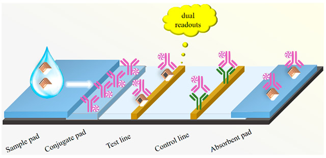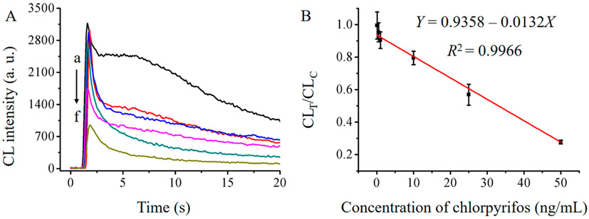 Description:Manganese dioxide nanoflowers (MnO| NFs) were synthesized and used as a dual readout probe to develop a novel immunochromatographic test strip (ITS) for detecting pesticide residues using chlorpyrifos as the model analyte. MnO| NFs-labeled antibody for chlorpyrifos was employed as the signal tracer for conducting the ITS. After 10 min competitive immunoreaction, the tracer antibody was captured by the immobilized immunogen in the test strip, resulting in the captured MnO| NFs on test line. The captured MnO| NFs led to the appearance of brown color on the test line, which could be easily observed by the naked eye as a qualitative readout. Due to the very slight colorimetric difference of chlorpyrifos at trace concentrations, the semiquantitative readout by naked eyes could not meet the demand of quantitative analysis. MnO| NFs showed a significant effect on the luminol-H|O| chemiluminescent (CL) system, and the CL signal driven by MnO| NFs were used to detect the trace concentration of chlorpyrifos quantitatively. 1,3-Diphenylisobenzofuran quenching studies and TMB-H|O| coloration assays were conducted for studying the enhancing mechanism of MnO| NFs, which was based on the oxidant activity to decompose H|O| for forming reactive oxygen species. Under optimal conditions, the linear range of chlorpyrifos was 0.1-50 ng/mL with a low detection limit of 0.033 ng/mL (S/N = 3). The reliability of the dual-readout ITS was successfully demonstrated by the application on traditional Chinese medicine and environmental water samples. Due to the simultaneous rapid-qualitative and sensitive-quantitative detection, the dual-readout protocol provides a promising strategy for rapid screening and field assay on various areas such as environmental monitoring and food safety.