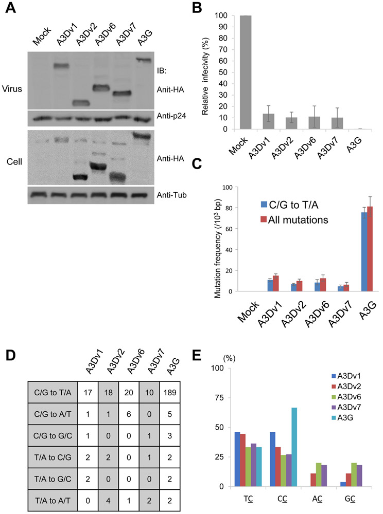 Description:The apolipoprotein B mRNA-editing enzyme catalytic polypeptide-like (APOBEC) protein family members have cytidine deaminase activity and can induce cytosine to uracil transition in nucleic acid. The main function of APOBEC3 (A3) proteins is to trigger an innate immune response to viral infections. Recent reports have shown that several APOBEC family proteins such as A3B can induce somatic mutations into genomic DNA and thus promote cancer development. However, the role of A3D on somatic mutations is unclear. Here, we identified the alternative splicing of A3D, and investigated each splice variant's subcellular localization and role in DNA mutagenesis. We identified four A3D variants, which all have one or two cytidine deaminase domains. The full-length form of A3D (variant 1) and truncated forms of A3D (variant 2, 6, 7) showed the ability to induce C/G to T/A transitions in foreign DNA and genomic DNA and retained antiretroviral activity. Furthermore, we demonstrated that A3D and A3B could induce deletions that are possibly repaired by microhomology-mediated end joining (MMEJ). Taken together, our experiments illustrated that alternative splicing generates functional diversity of A3D, and some variants can act as DNA mutators in genomic DNA.
