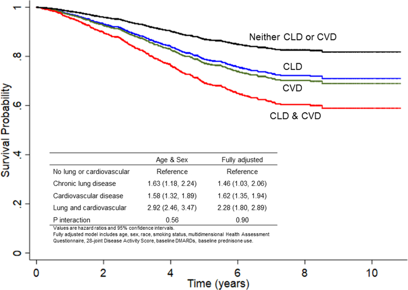 Among participants in the Veterans Affairs Rheumatoid Arthritis (VARA) Registry, a prospective cohort of U.S. Veterans with RA, we identified CLD and cardiovascular disease (CVD) using administrative and registry data. Demographics, smoking status, RA characteristics including Disease Activity Score in 28 joints (DAS28), and disease-modifying anti-rheumatic drug (DMARD) use were obtained from registry data, which was linked to the National Death Index to obtain vital status. We evaluated associations of CLD with survival using multivariable Cox regression models.