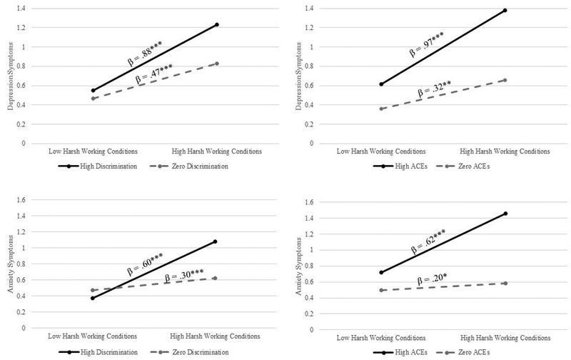 Description:Migrant farmwork is often characterized by harsh working conditions that carry significant physical and mental health consequences. Using a learned helplessness framework, the current study examined the extent to which discrimination, immigration legal status difficulties, and adverse childhood experiences moderated the effects of harsh working conditions on depression and anxiety. The study also examined the extent to which harsh working conditions mediated the effects of discrimination, immigration legal status difficulties, and adverse childhood experiences on depression and anxiety. Participants were 241 migrant farmworkers recruited in the Midwest. Participants completed interviews consisting of the Migrant Farmworker Stress Index (MFWSI), Adverse Childhood Events scale (ACEs), Everyday Discrimination Scale, the Centers for Epidemiology Scale for Depression (CES-D), and the seven item Generalized Anxiety Disorder scale (GAD-7). Tests of indirect effects suggested, working conditions mediated the effects of ACEs, immigration legal status fears, and discrimination on CES-D and GAD-7 scores (|-values < .05). Higher ACEs and discrimination also appeared to be associated with larger effects of harsh working conditions on depression and anxiety (|-values < .05), while legal status fears did not significantly moderate the effect of harsh working conditions on either outcome (|-values > .05). Likely through different mechanisms, adverse childhood experiences, discrimination and immigration legal status are associated with higher risk of harsh working conditions and subsequently these conditions account for much of the relations between these three stressors with depression and anxiety. Additionally, discrimination and adverse childhood experiences appear to then enhance the effects of working conditions.