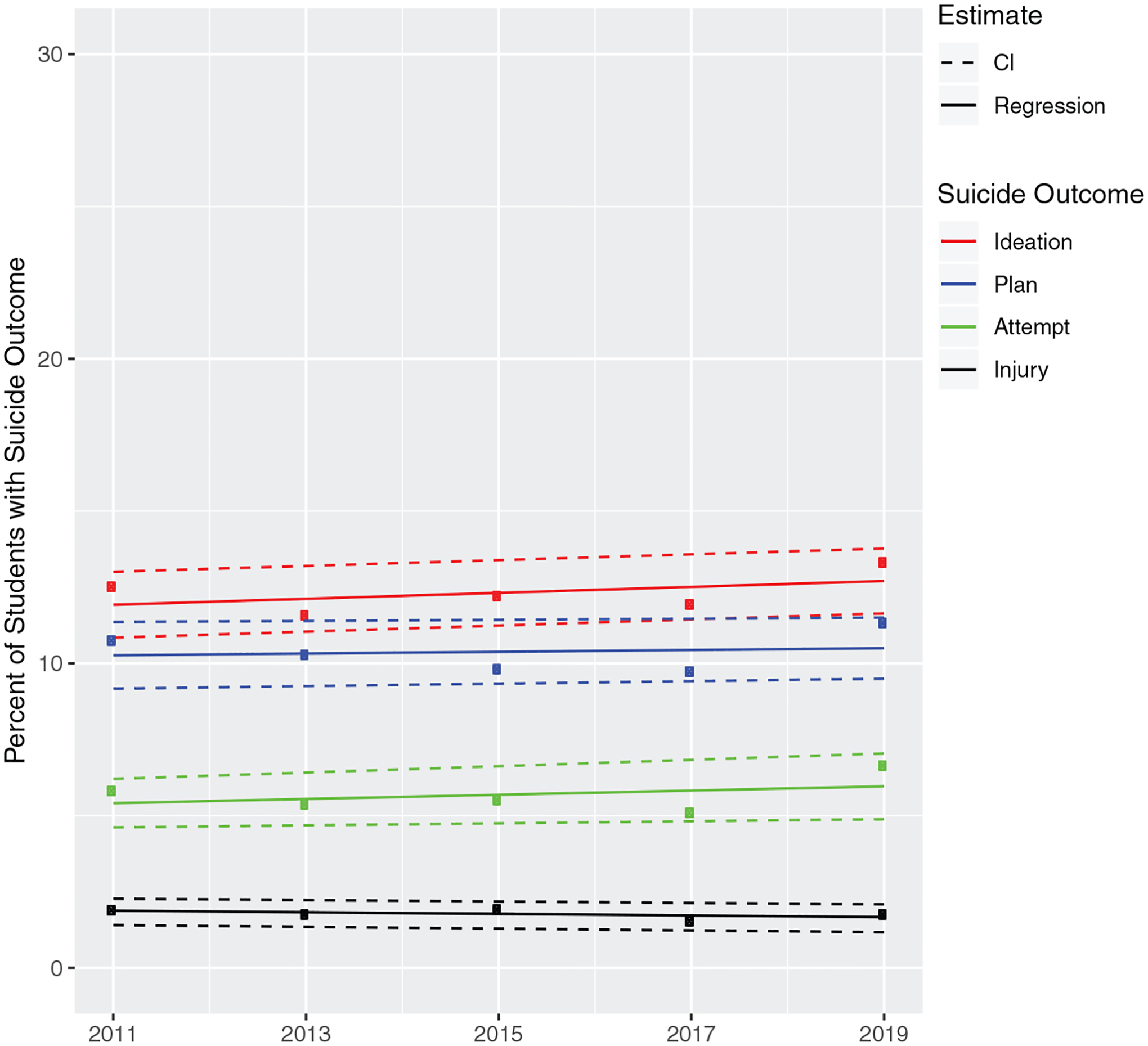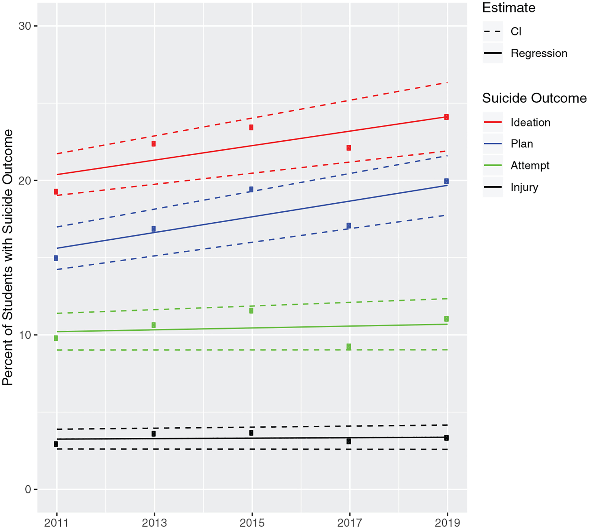 Suicidal ideation and plans are increasing among US adolescents. Changing prevalence of online victimization is frequently hypothesized as an explanation for this increase. We tested trends in online and offline victimization and whether they contribute to recent trends in adolescent suicidal outcomes.