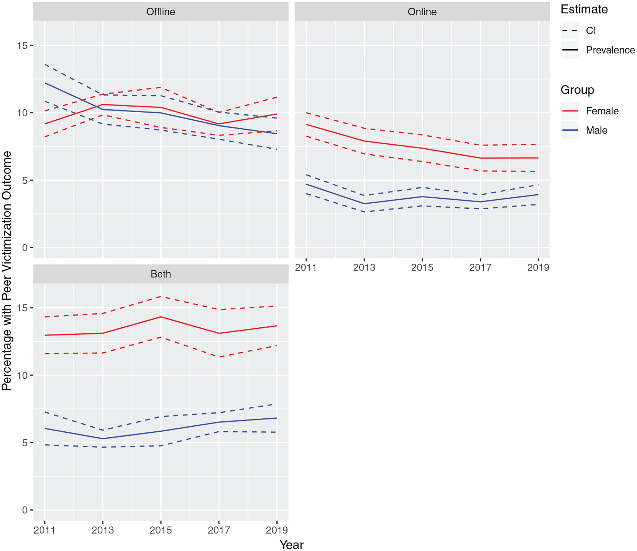 Although suicidal ideation and plans increased among US adolescents (mainly girls), online and offline victimization prevalence did not increase over time (offline: 20.0% in 2011, 19.5% in 2019; online: 16.2% in 2011, 15.7% in 2019). Online and offline victimization were associated with suicidal outcomes, especially co-occurring online and offline victimization (eg, adjusted odds ratio [co-occurring online and offline victimization versus none, outcome: suicidal injury] = 8.37; 95% confidence interval: 7.06–9.91). The magnitude of the associations between victimization and suicidal outcomes largely remained stable over time.