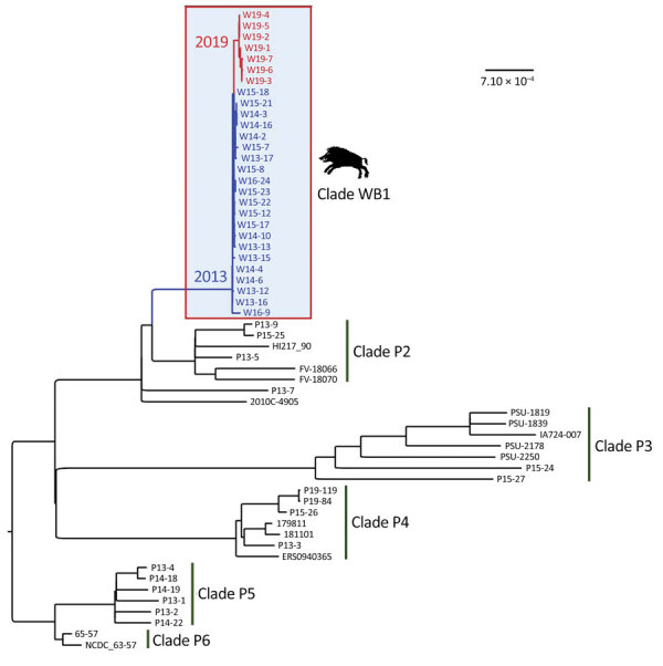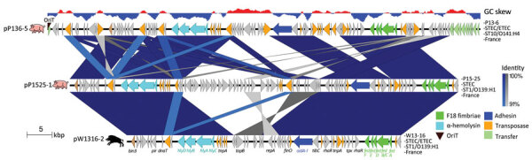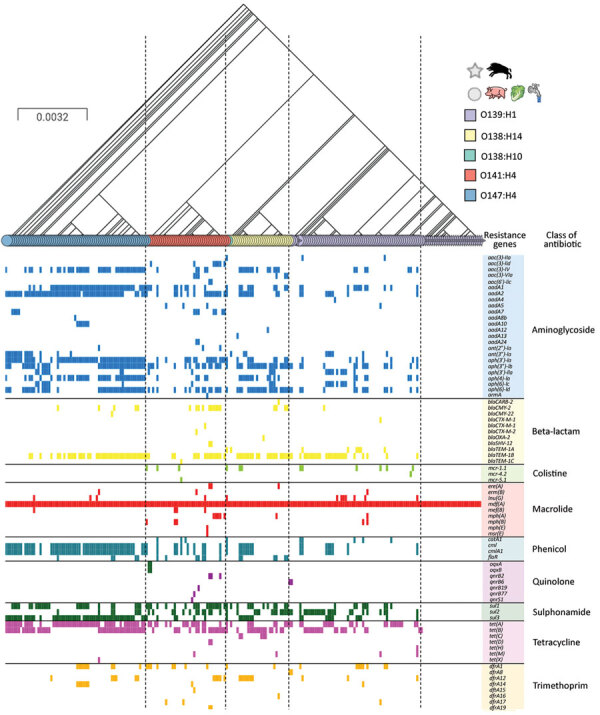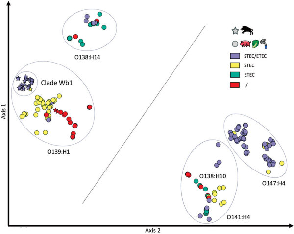 Description:Edema disease is an often fatal enterotoxemia caused by specific strains of Shiga toxin-producing Escherichia coli (STEC) that affect primarily healthy, rapidly growing nursery pigs. Recently, outbreaks of edema disease have also emerged in France in wild boars. Analysis of STEC strains isolated from wild boars during 2013-2019 showed that they belonged to the serotype O139:H1 and were positive for both Stx2e and F18 fimbriae. However, in contrast to classical STEC O139:H1 strains circulating in pigs, they also possessed enterotoxin genes sta1 and stb, typical of enterotoxigenic E. coli. In addition, the strains contained a unique accessory genome composition and did not harbor antimicrobial-resistance genes, in contrast to domestic pig isolates. These data thus reveal that the emergence of edema disease in wild boars was caused by atypical hybrid of STEC and enterotoxigenic E. coli O139:H1, which so far has been restricted to the wildlife environment.