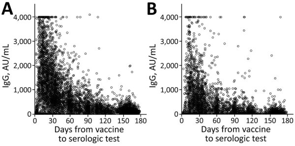 Description:Israel experienced a new wave of coronavirus disease during June 2021, six months after implementing a national vaccination campaign. We conducted 3 discrete analyses using data from a large health maintenance organization in Israel to determine whether IgG levels of fully vaccinated persons decrease over time, describe the relationship between IgG titer and subsequent PCR-confirmed infection, and compare PCR-confirmed infection rates by period of vaccination. Mean IgG levels steadily decreased over the 6-month period in the total tested population and in all age groups. An inverse relationship was found between IgG titer and subsequent PCR-positive infection. Persons vaccinated during the first 2 months of the campaign were more likely to become infected than those subsequently vaccinated. The vaccinated group >60 years of age had lower initial IgG levels and were at greater risk for infection. The findings support the decision to add a booster vaccine for persons >60 years of age.