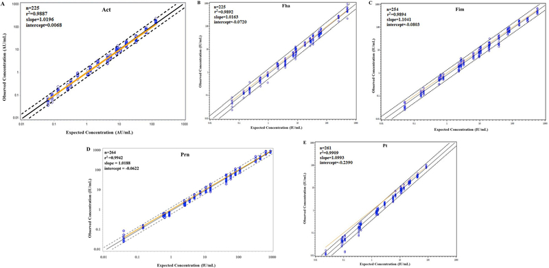Description:Despite wide spread vaccination, the public health burden of pertussis remains substantial. Current acellular pertussis vaccines comprise upto five Bordetella pertussis (Bp) antigens. Performing an ELISA to quantify antibody for each antigen is laborious and challenging to apply to pediatric samples where serum volume may be limited. We developed a microsphere based multiplex antibody capture assay (MMACA) to quantify antibodies to five pertussis antigens; pertussis toxin, pertactin, filamentous hemagglutinin and fimbrial antigens 2/3, and adenylate cyclase toxin in a single reaction (5-plex) with a calibrated reference standard, QC reagents and SAS| based data analysis program. The goodness of fit (R|) of the standard curves for five analytes was ≥0.99, LLOQ 0.04-0.15 IU or AU/mL, accuracy 1.9%-23.8% (%E), dilutional linearity slopes 0.93-1.02 and regression coefficients r| = 0.91-0.99. MMACA had acceptable precision within a median CV of 16.0%-22.8%. Critical reagents, antigen conjugated microsphere and reporter antibody exhibited acceptable (<12.3%) lot-lot variation. MMACA can be completed in <3 h, requires low serum volume (5μL/multiplex assay) and has fast data turnaround time (<1 min). MMACA has been successfully developed and validated as a sensitive, specific, robust and rugged method suitable for simultaneous quantification of anti-Bp antibodies in serum, plasma and DBS.
