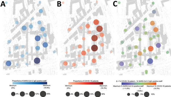 Description:Hospital staff are at high risk for severe acute respiratory syndrome coronavirus 2 (SARS-CoV-2) infection during the coronavirus disease (COVID-19) pandemic. This cross-sectional study aimed to determine the prevalence of SARS-CoV-2 infection in hospital staff at the University Hospital rechts der Isar in Munich, Germany, and identify modulating factors. Overall seroprevalence of SARS-CoV-2-IgG in 4,554 participants was 2.4%. Staff engaged in direct patient care, including those working in COVID-19 units, had a similar probability of being seropositive as non-patient-facing staff. Increased probability of infection was observed in staff reporting interactions with SARS-CoV-2‒infected coworkers or private contacts or exposure to COVID-19 patients without appropriate personal protective equipment. Analysis of spatiotemporal trajectories identified that distinct hotspots for SARS-CoV-2‒positive staff and patients only partially overlap. Patient-facing work in a healthcare facility during the SARS-CoV-2 pandemic might be safe as long as adequate personal protective equipment is used and infection prevention practices are followed inside and outside the hospital.
