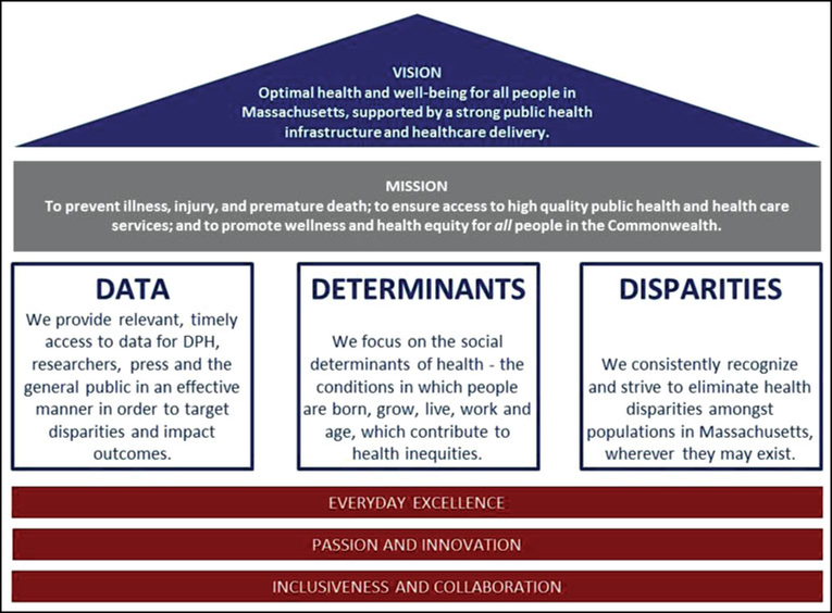 In 2015, the Massachusetts Department of Public Health (MDPH) adopted a Title V maternal and child health priority to “promote health and racial equity by addressing racial justice and reducing disparities.” A survey assessing staff capacity to support this priority identified data collection and use as opportunities for improvement. In response, MDPH initiated a quality improvement project to improve use of data for action to promote racial equity.
