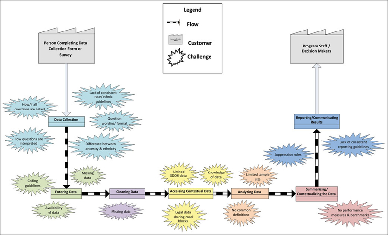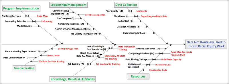MDPH conducted value stream mapping to understand existing processes for using data to inform racial equity work. Key informant interviews and a survey of program directors identified challenges to using data to promote racial equity. MDPH used a cause-and-effect diagram to identify and organize challenges to using data to inform racial equity work and better understand opportunities for improvement and potential solutions.