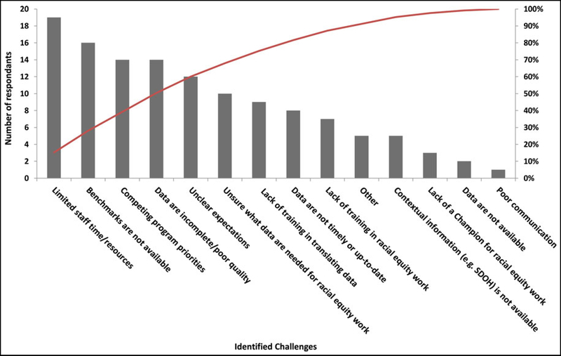 Key informants highlighted the need to consider structural factors and historical and community contexts when interpreting data. Program directors noted limited staff time, lack of performance metrics, competing priorities, low data quality, and unclear expectations as challenges. To address the identified challenges, the team identified potential solutions and prioritized development and piloting of the MDPH Racial Equity Data Road Map (Road Map).