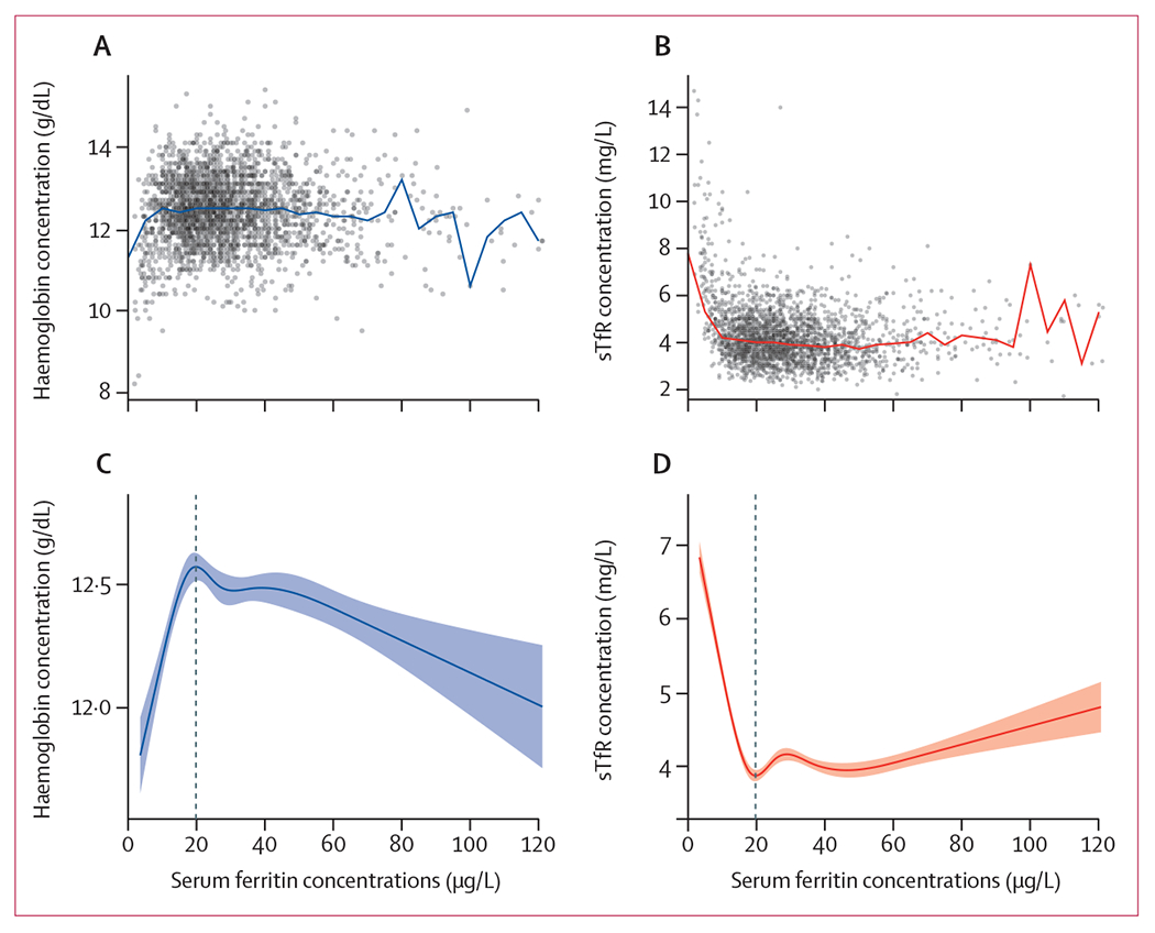 5964 children and 10 462 non-pregnant women had physical examinations and were screened for inclusion in the study, of whom 2569 (43·1%) children and 7498 (71·7%) non-pregnant women were included. At lower serum ferritin concentrations, median haemoglobin concentration decreased as sTfR concentration increased, with each varying in a curvilinear manner. Using restricted cubic spline plateau points to determine the onset of iron-deficient erythropoiesis, the serum ferritin thresholds identified by haemoglobin and sTfR concentrations were not different. For children, the haemoglobin identified serum ferritin threshold was 19·9 μg/L (95% CI 18·8–22·6) and the sTfR identified serum ferritin threshold was 20·0 μg/L (19·4–20·9; p=0·89). For women the haemoglobin identified serum ferritin threshold was 25·2 μg/L (24·2–26·2) and the sTfR identified serum ferritin threshold was 24·0 μg/L (23·3–24·6; p=0·05).