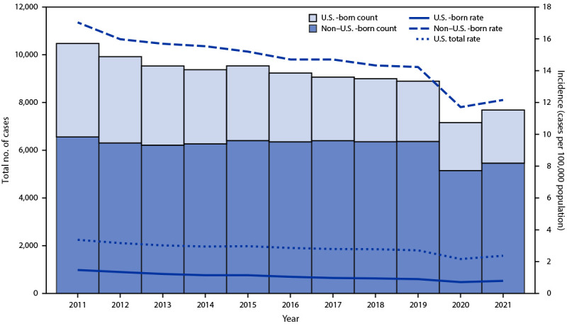 Description:During 1993-2019, the incidence of Tuberculosis (TB) in the United States decreased steadily; however, during the later years of that period the annual rate of decline slowed (1) until 2020 when a substantial decline (19.9%) was observed. This sharp decrease in TB incidence might have been related to multiple factors coinciding with the COVID-19 pandemic, including delayed or missed TB diagnoses or a true reduction in TB incidence related to pandemic mitigation efforts and changes in immigration and travel (2). During 2021, a total of 7,860 TB cases were provisionally reported to CDC's National Tuberculosis Surveillance System (NTSS) by the 50 U.S. states and the District of Columbia (DC). National incidence of reported TB (cases per 100,000 persons) rose 9.4% during 2021 (2.37) compared with that in 2020 (2.16) but remained 12.6% lower than the rate during 2019 (2.71).* During 2021, TB incidence increased among both U.S.-born and non-U.S.-born persons. The increased TB incidence observed during 2021 compared with 2020 might be partially explained by delayed Diagnosis of cases in persons with symptom onset during 2020; however, the continued, substantial reduction from prepandemic levels raises concern for ongoing underDiagnosis. TB control and Prevention services, including early Diagnosis and complete treatment of TB and latent TB infection, should be maintained and TB awareness promoted to achieve elimination in the United States