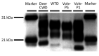 Description:Chronic wasting disease (CWD) is a naturally-occurring neurodegenerative disease of cervids. Raccoons (Procyon lotor) and meadow voles (Microtus pennsylvanicus) have previously been shown to be susceptible to the CWD agent. To investigate the potential for transmission of the agent of CWD from white-tailed deer to voles and subsequently to raccoons, we intracranially inoculated raccoons with brain homogenate from a CWD-affected white-tailed deer (CWD|) or derivatives of this isolate after it had been passaged through voles 1 or 5 times. We found that passage of the CWD| isolate through voles led to a change in the biologic behavior of the CWD agent, including increased attack rates and decreased incubation periods in raccoons. A better understanding of the dynamics of cross-species transmission of CWD prions can provide insights into how these infectious proteins evolve in new hosts.