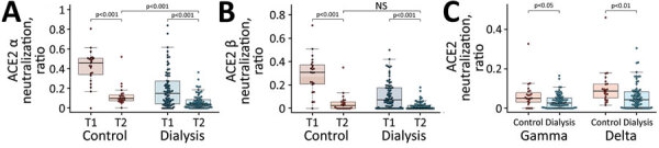 Description:Patients undergoing chronic hemodialysis were among the first to receive severe acute respiratory syndrome coronavirus 2 (SARS-CoV-2) vaccinations because of their increased risk for severe coronavirus disease and high case-fatality rates. By using a previously reported cohort from Germany of at-risk hemodialysis patients and healthy donors, where antibody responses were examined 3 weeks after the second vaccination, we assessed systemic cellular and humoral immune responses in serum and saliva 4 months after vaccination with the Pfizer-BioNTech BNT162b2 vaccine using an interferon-γ release assay and multiplex-based IgG measurements. We further compared neutralization capacity of vaccination-induced IgG against 4 SARS-CoV-2 variants of concern (Alpha, Beta, Gamma, and Delta) by angiotensin-converting enzyme 2 receptor-binding domain competition assay. Sixteen weeks after second vaccination, compared with 3 weeks after, cellular and humoral responses against the original SARS-CoV-2 isolate and variants of concern were substantially reduced. Some dialysis patients even had no detectable B- or T-cell responses.