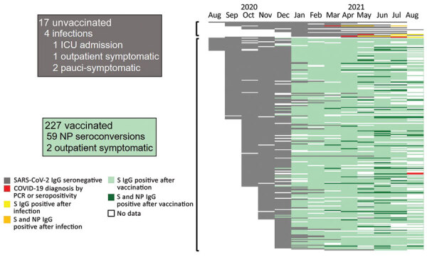 Description:Severe acute respiratory syndrome coronavirus 2 (SARS-CoV-2) antibodies decay but persist 6 months postvaccination; lower levels of neutralizing titers persist against Delta than wild-type virus. Of 227 vaccinated healthcare workers tested, only 2 experienced outpatient symptomatic breakthrough infections, despite 59/227 exhibiting serologic evidence of SARS-CoV-2 infection, defined as presence of nucleocapsid protein antibodies.