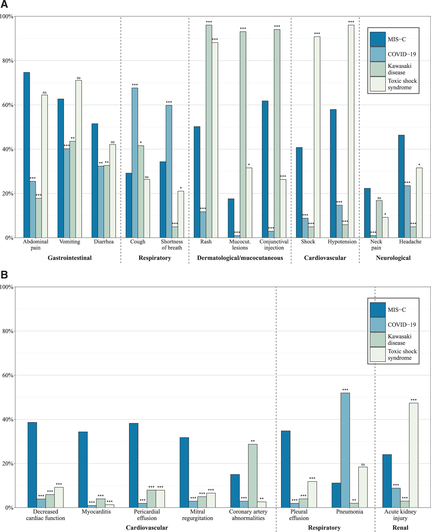 A total of 233 patients with MIS-C, 102 with COVID-19, 101 with KD, and 76 with TSS were included in the analysis. Patients with MIS-C had the highest prevalence of decreased cardiac function (38.6%), myocarditis (34.3%), pericardial effusion (38.2%), mitral regurgitation (31.8%) and pleural effusion (34.8%) compared with patients with the other conditions. Patients with MIS-C had increased peak levels of C-reactive protein and decreased platelets and lymphocyte nadir counts compared with patients with COVID-19 and KD and elevated levels of troponin, brain natriuretic peptide and pro-brain natriuretic peptide compared with COVID-19. Diagnostic scores utilizing clinical findings effectively distinguished MIS-C from COVID-19, KD, and TSS, with internal validation showing area under the curve ranging from 0.87 to 0.97.