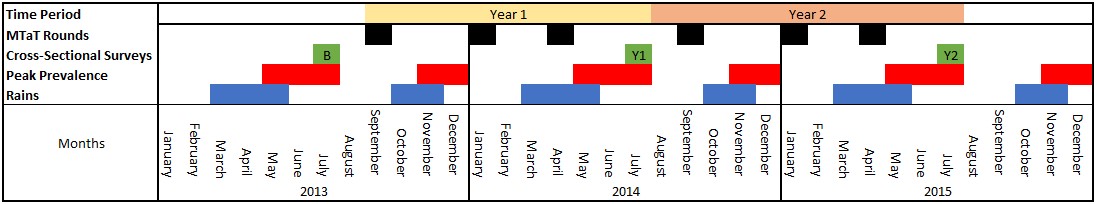 Demographic and behavioral characteristics, including LLIN usage, were similar between arms at each survey. MTaT coverage across the 3 annual rounds ranged between 75.0% and 77.5% in year 1, and between 81.9% and 94.3% in year 2. The adjusted effect size of MTaT on the prevalence of parasitemia between arms was 0.93 (95% confidence interval [CI], .79–1.08) and 0.92 (95% CI, .76–1.10) after year 1 and year 2, respectively.