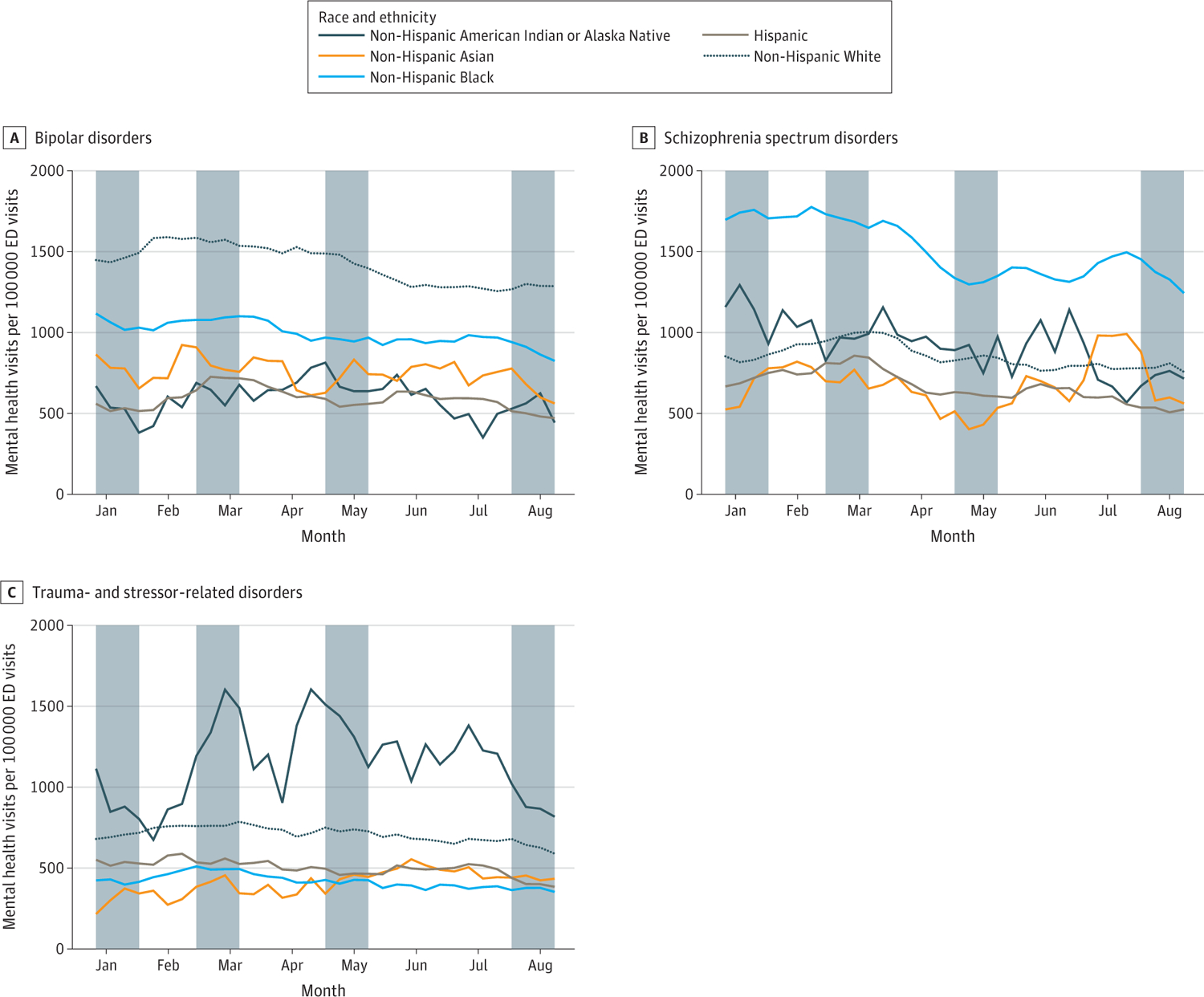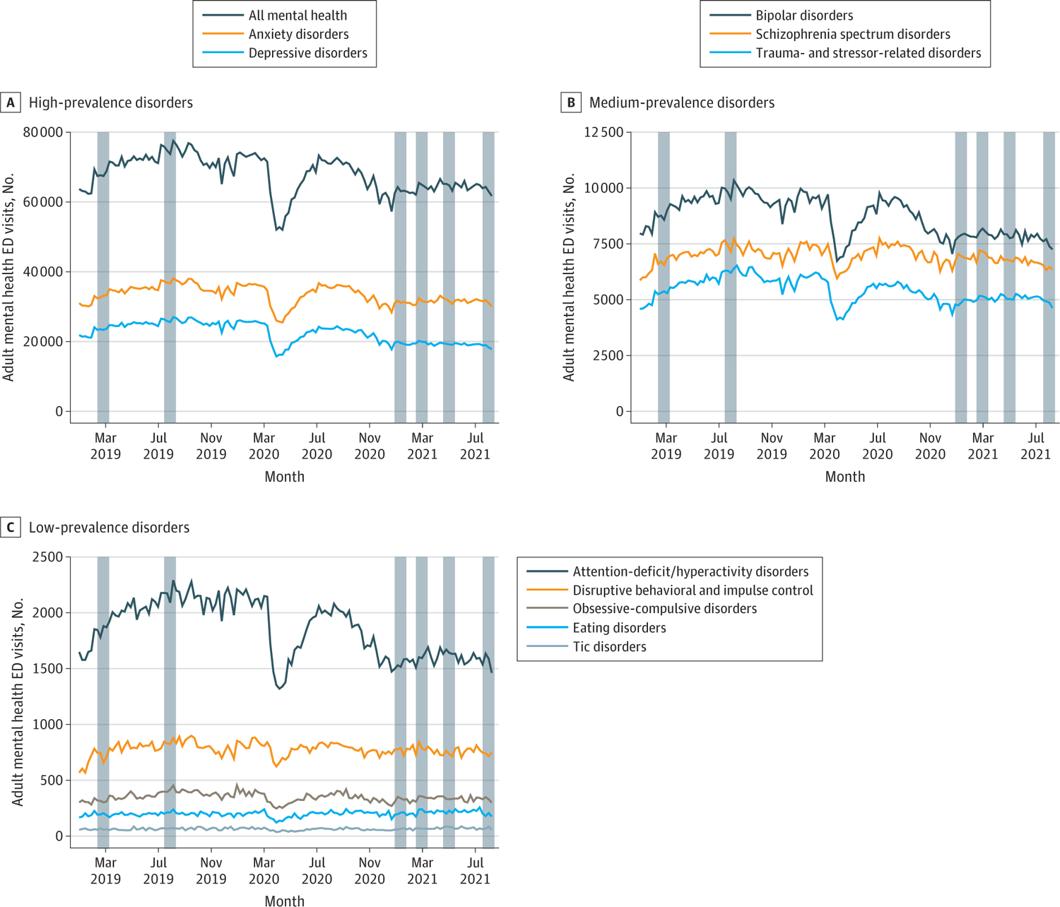 This epidemiologic cross-sectional study used National Syndromic Surveillance Program data from US adults aged 18 to 64 years from 1970 to 2352 ED facilities from January 1, 2019, to August 14, 2021. All MH-related ED visits and visits related to 10 disorders (ie, anxiety, depressive, bipolar, schizophrenia spectrum, trauma- and stressor-related, attention-deficit/hyperactivity, disruptive behavioral and impulse, obsessive-compulsive, eating, and tic disorders) were identified.