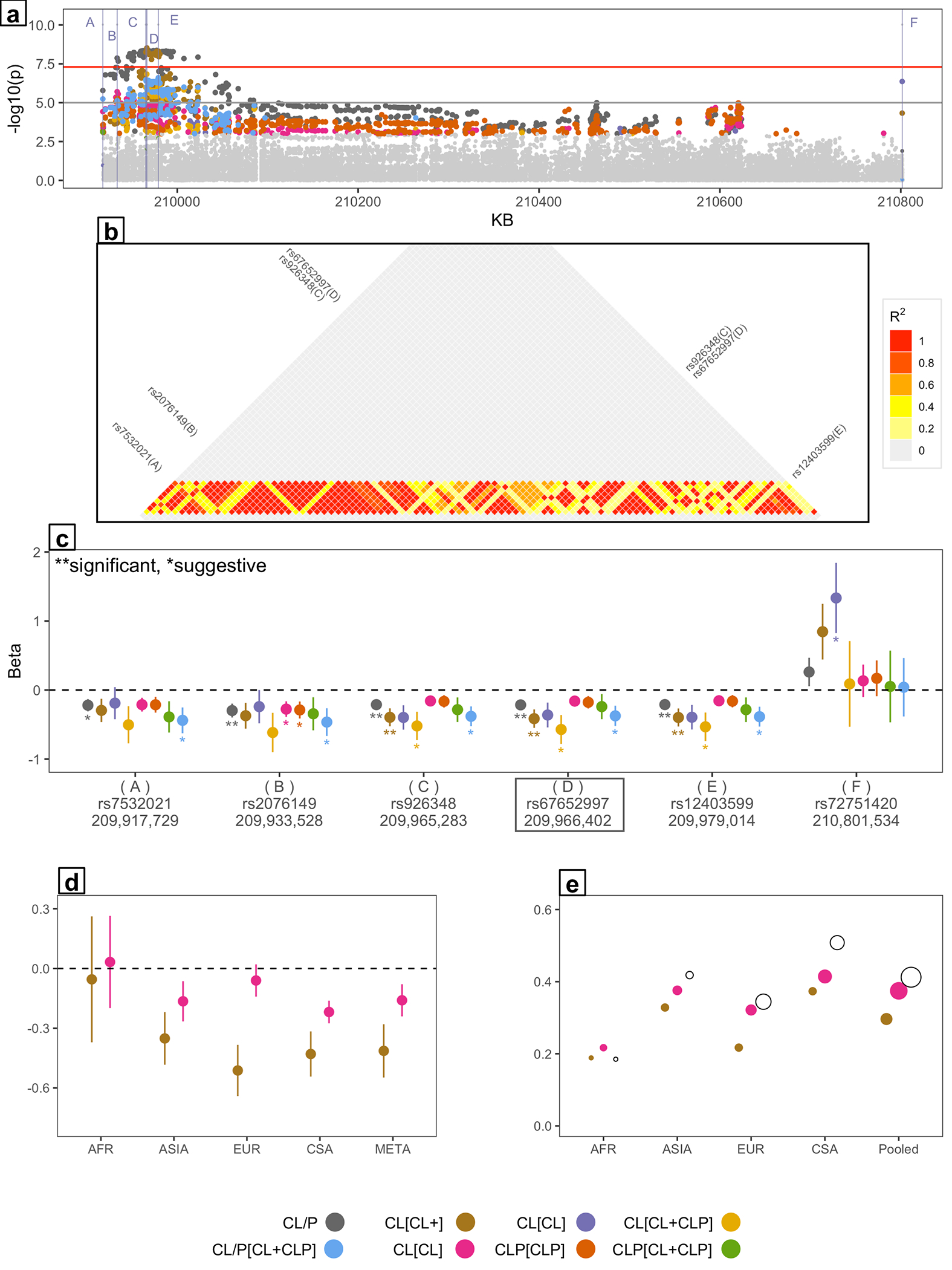 Description:Nonsyndromic orofacial clefts (OFCs) are among the most common craniofacial birth defects worldwide, and known to exhibit phenotypic and genetic heterogeneity. Cleft lip plus cleft palate (CLP) and cleft lip only (CL) are commonly combined together as one phenotype (CL/P), separately from cleft palate alone. In comparison, our study analyzes CL and CLP separately. A sample of 2218 CL and CLP cases, 4537 unaffected relatives of cases, and 2673 pure controls with no family history of OFC were selected from the Pittsburgh Orofacial Cleft (Pitt-OFC) multiethnic study.genome-wide association studies were run for seven specific phenotypes created based on the cleft type(s) observed within these families, as well as the combined CL/P phenotype. Five novel genome-wide significant associations, 3q29 (rs62284390), 5p13.2 (rs609659), 7q22.1 (rs6465810), 19p13.3 (rs628271), and 20q13.33 (rs2427238), and nine associations (p ≤ 1.0E-05) within previously confirmed OFC loci-PAX7, IRF6, FAM49A, DCAF4L2, 8q24.21, ARID3B, NTN1, TANC2 and the WNT9B:WNT3 gene cluster-were observed. We also found that single nucleotide polymorphisms within a subset of the associated loci, both previously known and novel, differ substantially in terms of their effects across cleft- or family-specific phenotypes, indicating not only etiologic differences between CL and CLP, but also genetic heterogeneity within each of the two OFC subtypes.