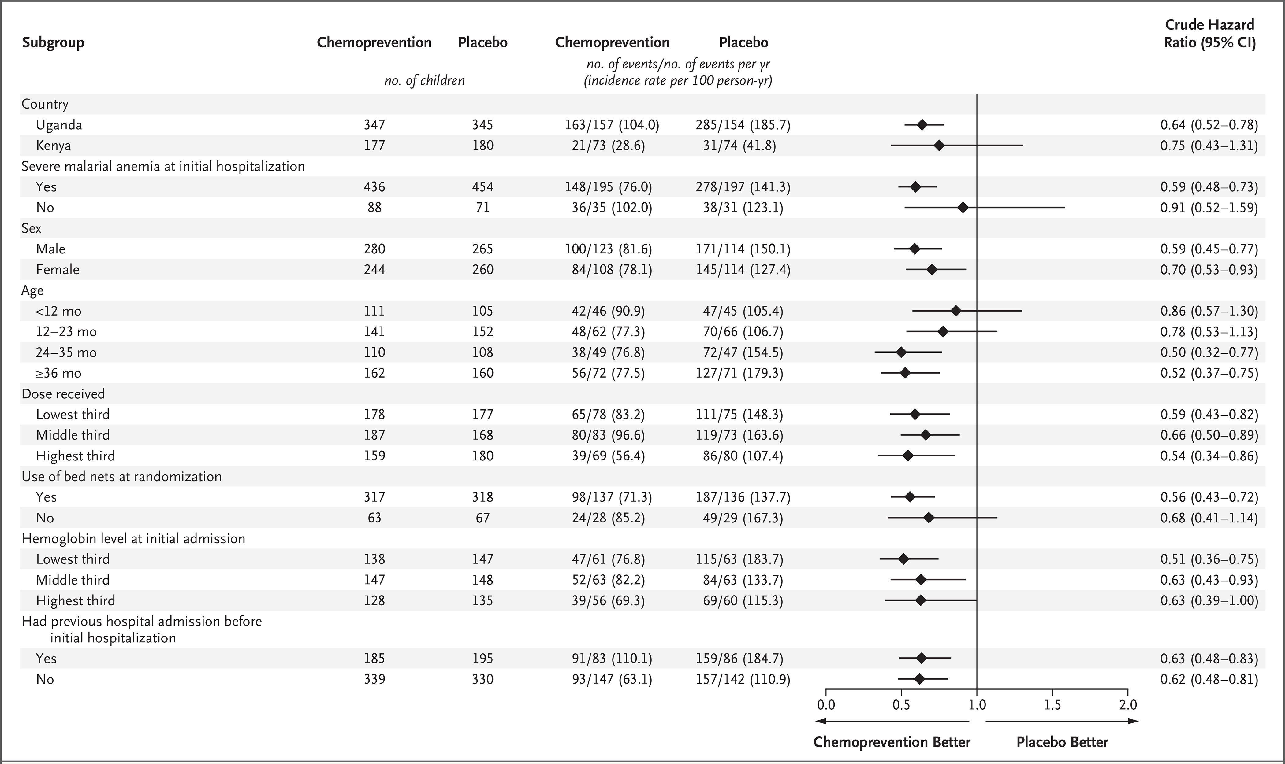 We conducted a multicenter, two-group, randomized, placebo-controlled trial in nine hospitals in Kenya and Uganda to determine whether 3 months of malaria chemoprevention could reduce morbidity and mortality after hospital discharge in children younger than 5 years of age who had been admitted with severe anemia. All children received standard in-hospital care for severe anemia and a 3-day course of artemether–lumefantrine at discharge. Two weeks after discharge, children were randomly assigned to receive dihydroartemisinin–piperaquine (chemoprevention group) or placebo, administered as 3-day courses at 2, 6, and 10 weeks after discharge. Children were followed for 26 weeks after discharge. The primary outcome was one or more hospital readmissions for any reason or death from the time of randomization to 6 months after discharge. Conditional risk-set modeling for recurrent events was used to calculate hazard ratios with the use of the Prentice–Williams–Peterson total-time approach.