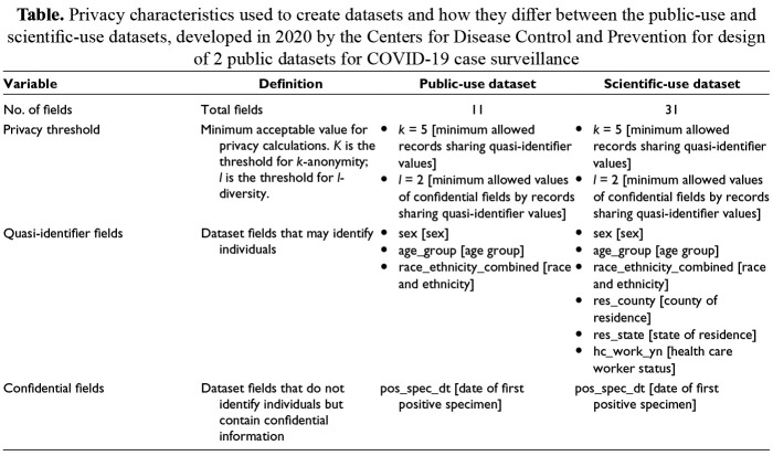 Methods: We included data elements based on usefulness, public request, and privacy implications; we suppressed some field values to reduce the risk of re-identification and exposure of confidential information. We created datasets and verified them for privacy and confidentiality by using data management platform analytic tools and R scripts.