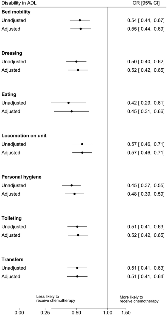 Of the 3,174 patients, 2,702 (85.2%) experienced disability in one or more ADLs and 64.7% had disability in 5–7 ADLs. A total of 415 (13.1%) patients received systemic therapy. There was a strong association between disability in each ADL and receipt of therapy including dressing (OR, 0.52 [95% CI, 0.42–0.65]), toileting (odds ratio, OR, 0.52 [95% confidence interval, CI, 0.42–0.65]), personal hygiene (OR, 0.48 [95% CI, 0.39–0.59]), transfers (OR, 0.51 [95% CI, 0.41–0.64]), bed mobility (OR, 0.55 [95% CI, 0.44–0.69]), locomotion (OR, 0.57 [95% CI, 0.46–0.71]), or eating (OR, 0.45 [95% CI, 0.31–0.67]). Compared to patients having no ADL disability, patients were less likely to receive chemotherapy if they had disability in 1–2 ADLs (OR, 0.95 [95% CI, 0.66–1.37]), 3–4 ADLs (OR, 0.81 [95% CI, 0.56–1.15]), or 5–7 ADLs (OR, 0.43 [95% CI, 0.33–0.56]).