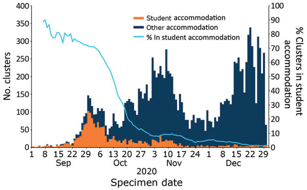 Description:Each September in England, ≈1 million students relocate to study at universities. To determine COVID-19 cases and outbreaks among university students after their return to university during the COVID pandemic in September 2020, we identified students with COVID-19 (student case-patients) by reviewing contact tracing records identifying attendance at university and residence in student accommodations identified by matching case-patients' residential addresses with national property databases. We determined COVID-19 rates in towns/cities with and without a university campus. We identified 53,430 student case-patients during September 1-December 31, 2020, which accounted for 2.7% of all cases during this period. Student case-patients increased rapidly after the start of the term, driven initially by cases and outbreaks in student accommodations. Case rates among students 18-23 years of age doubled at the start of term in towns with universities. Our findings highlight the need for face-to-face and control measures to reduce virus transmission.